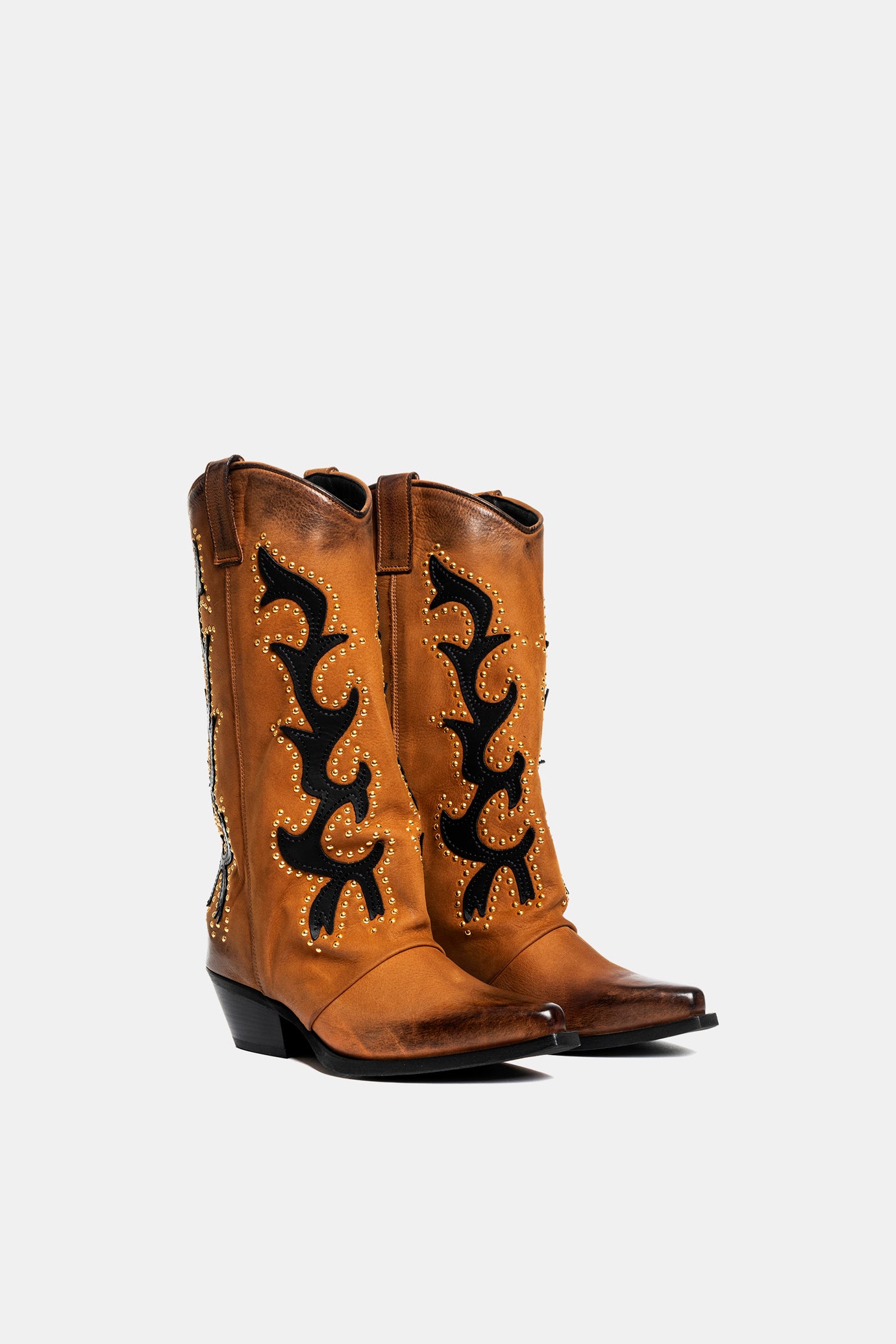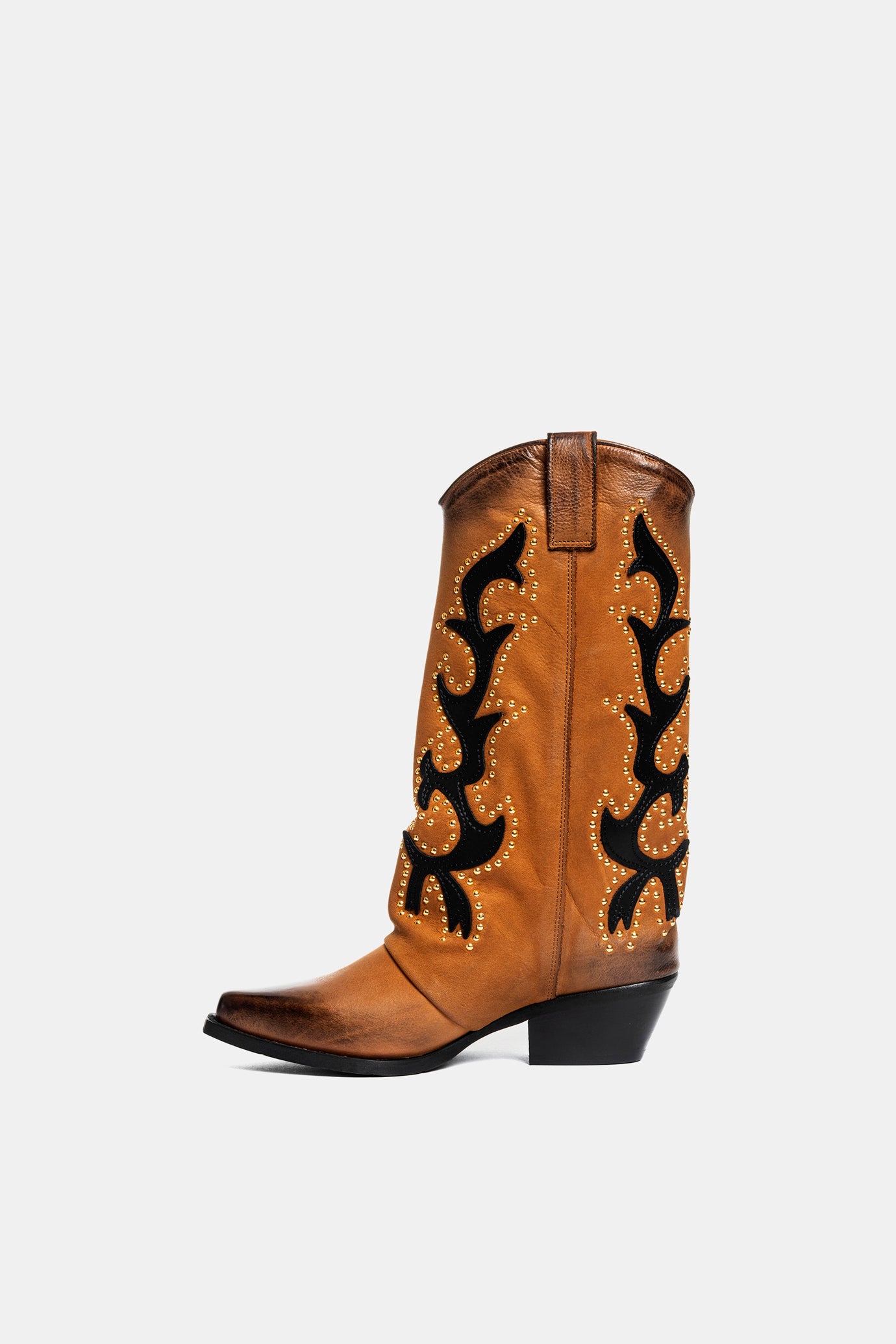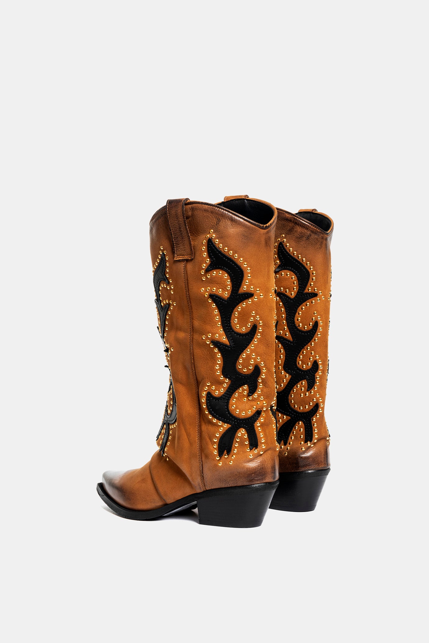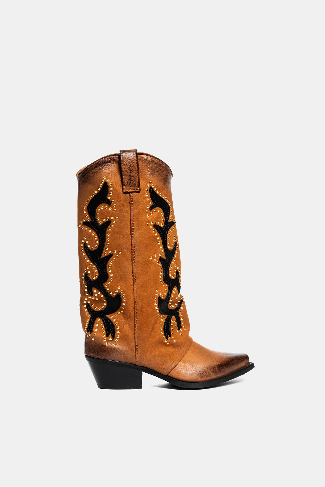 Nubuck leather Texan boots with black decorations and gold studs