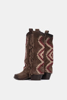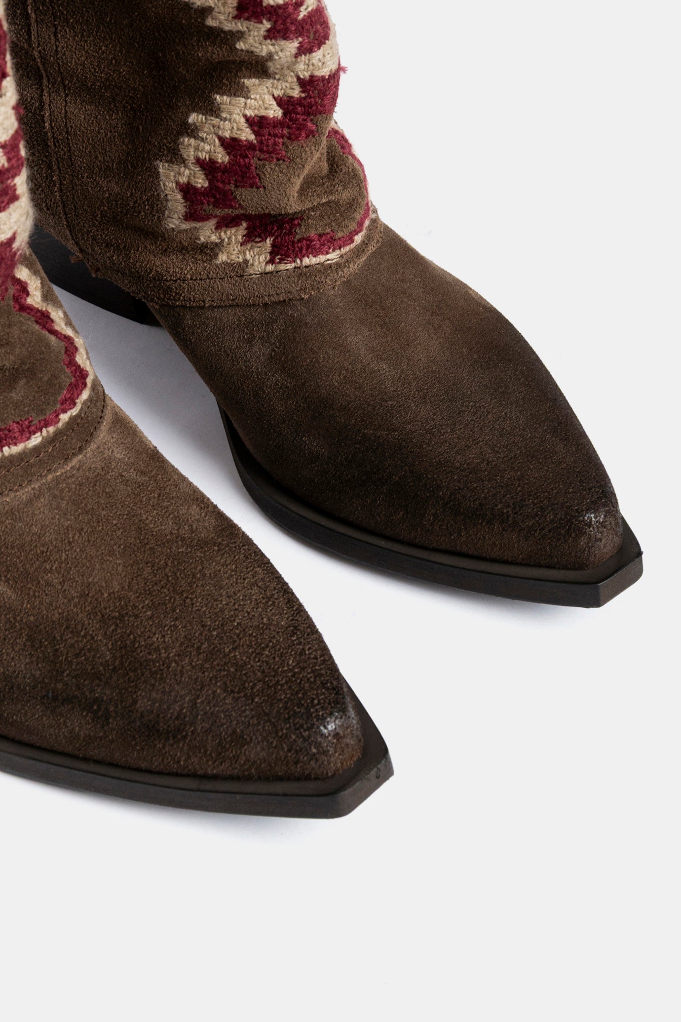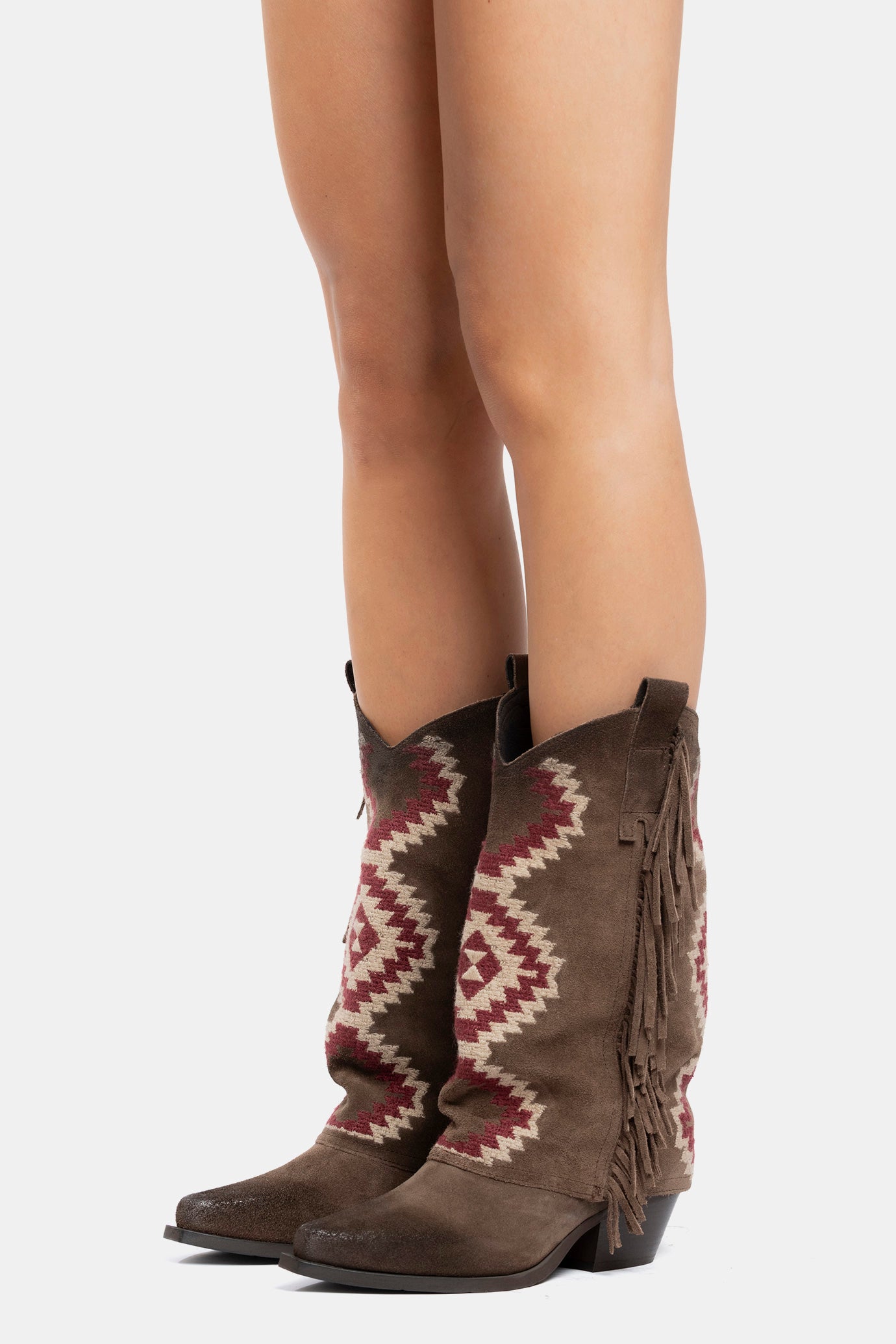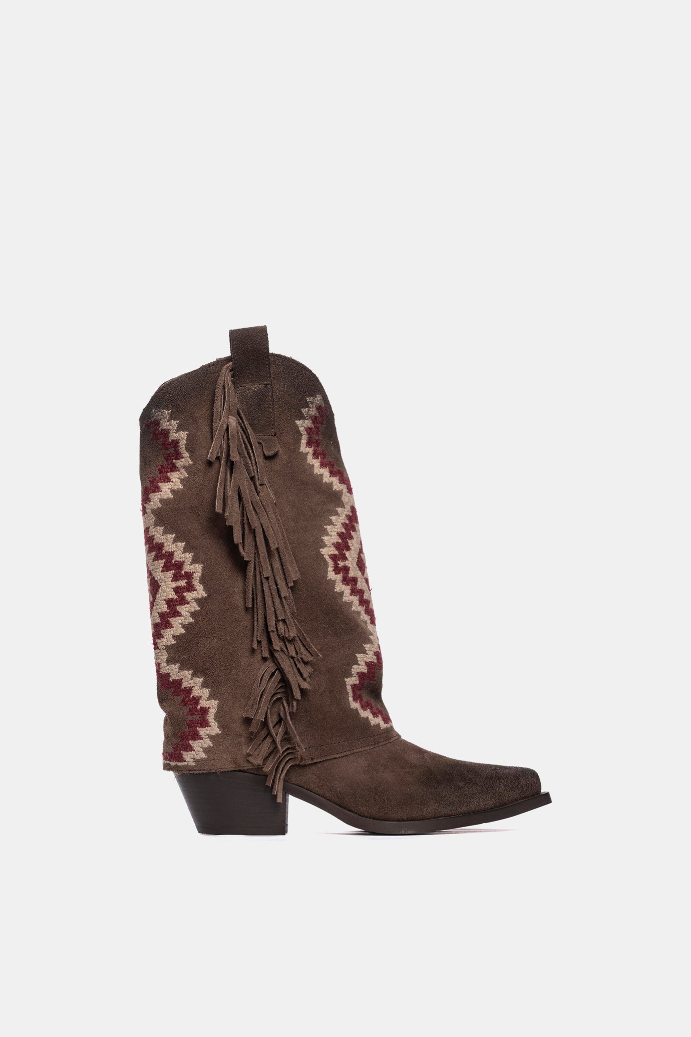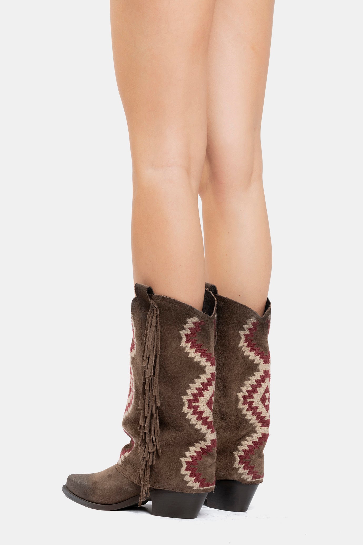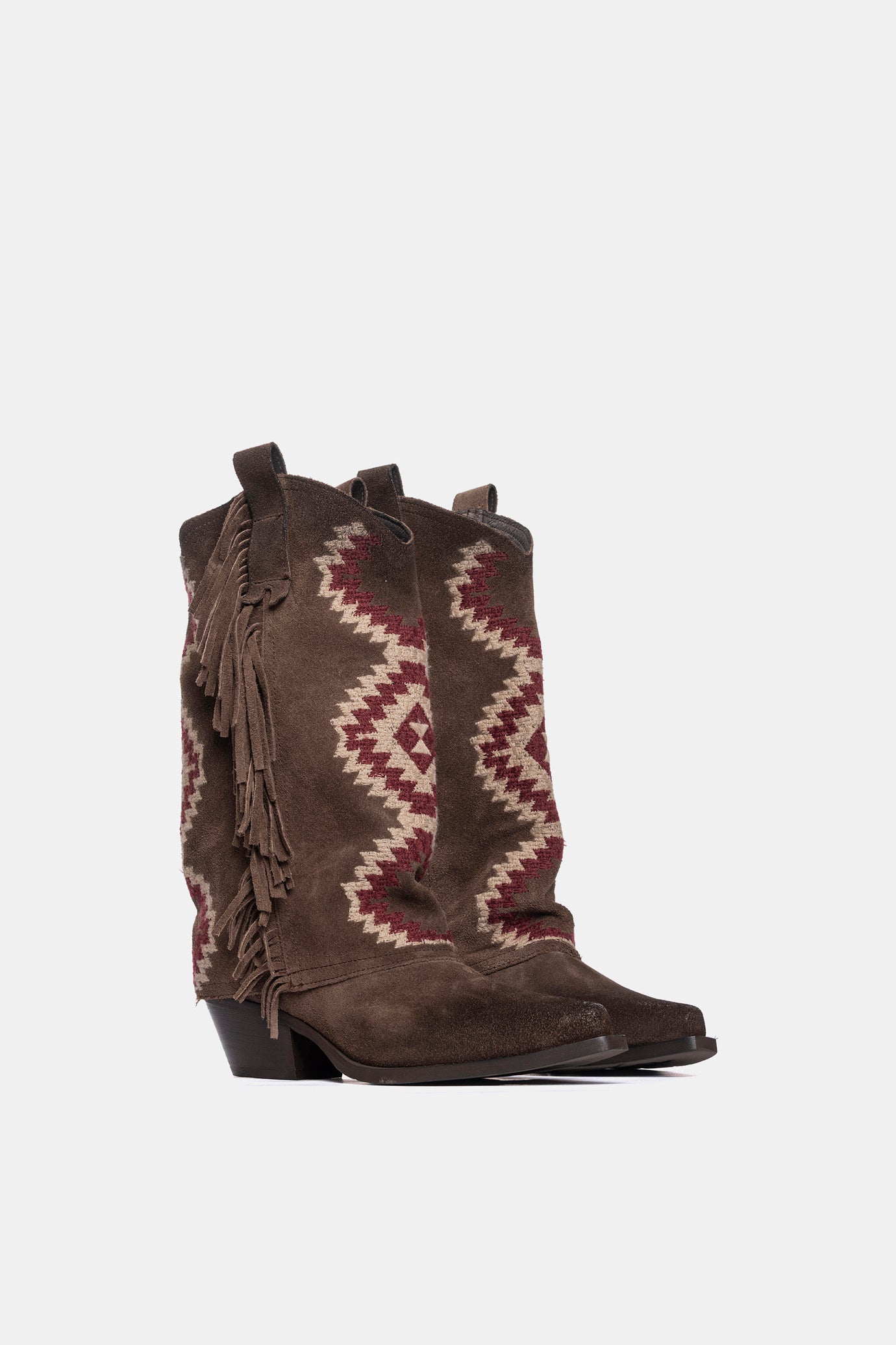 Stivali texani in camoscio mustang con ricami etnici e frange.
