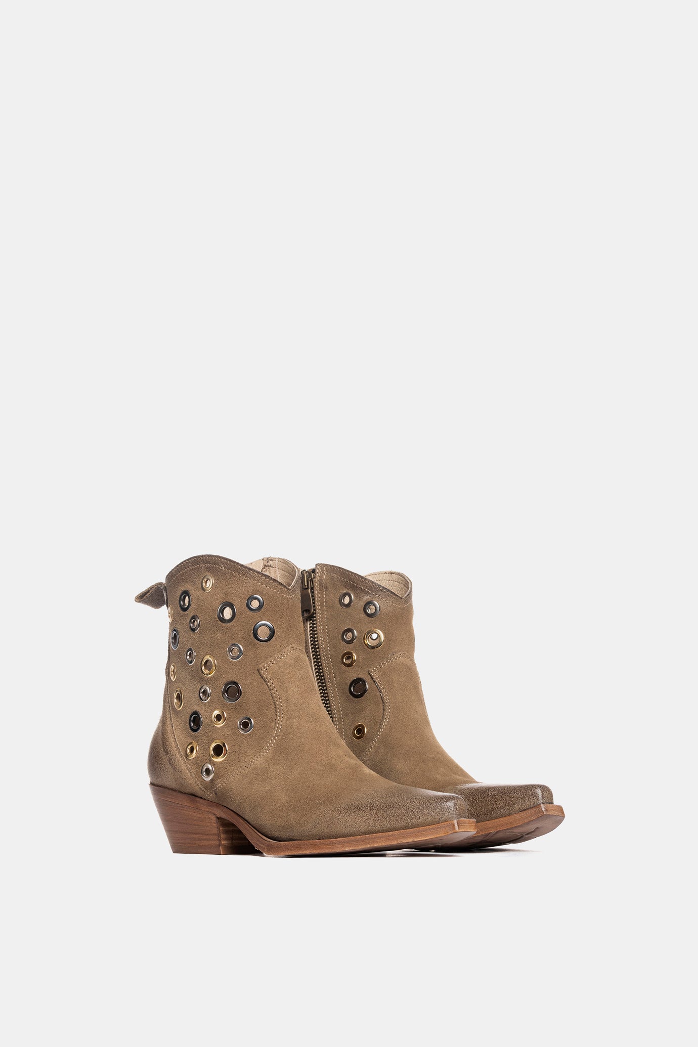 Dove grey suede Texan ankle boots with multicoloured eyelet applications