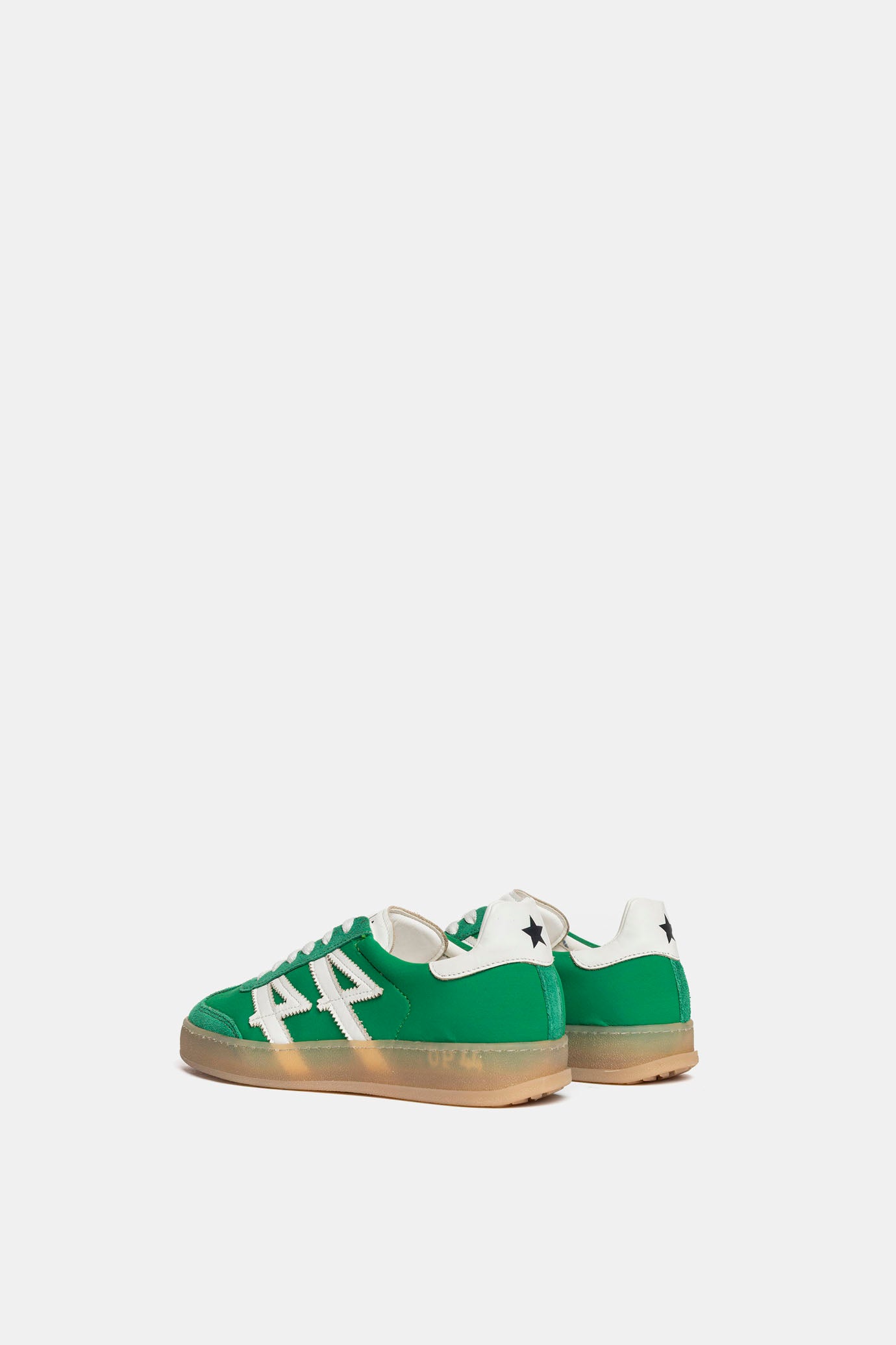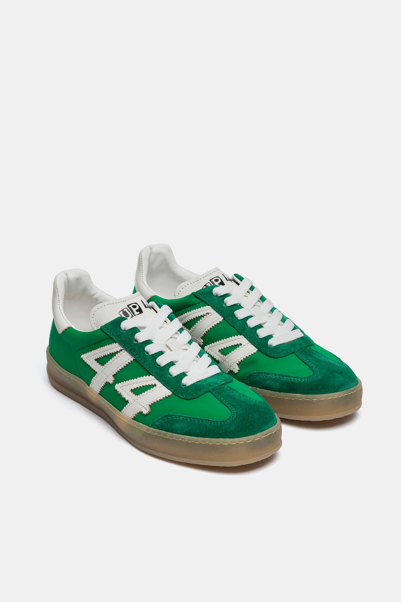Sneakers in green fabric and suede.