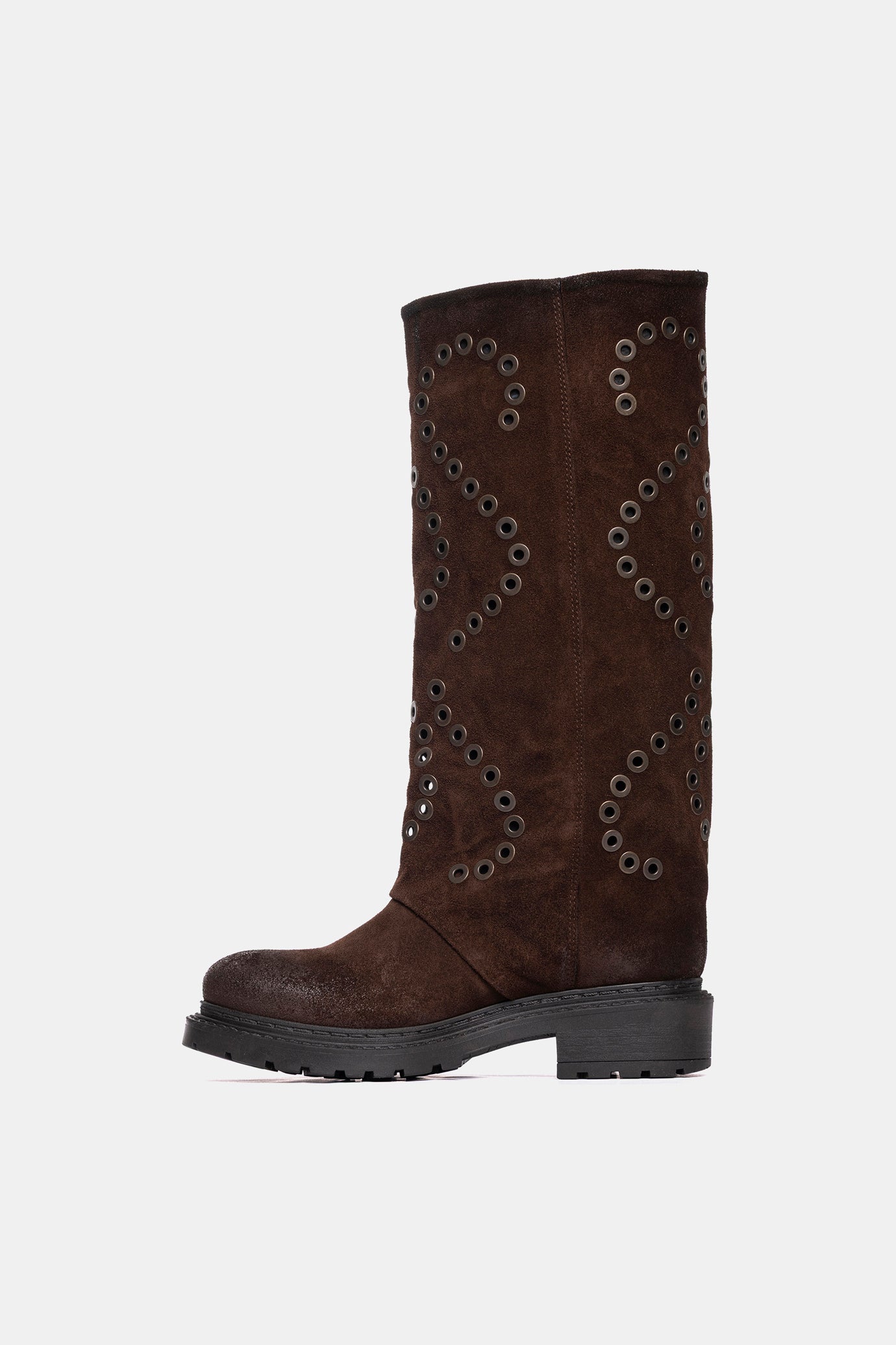 Stivali in camoscio testa di moro con applicazioni ad occhielli.