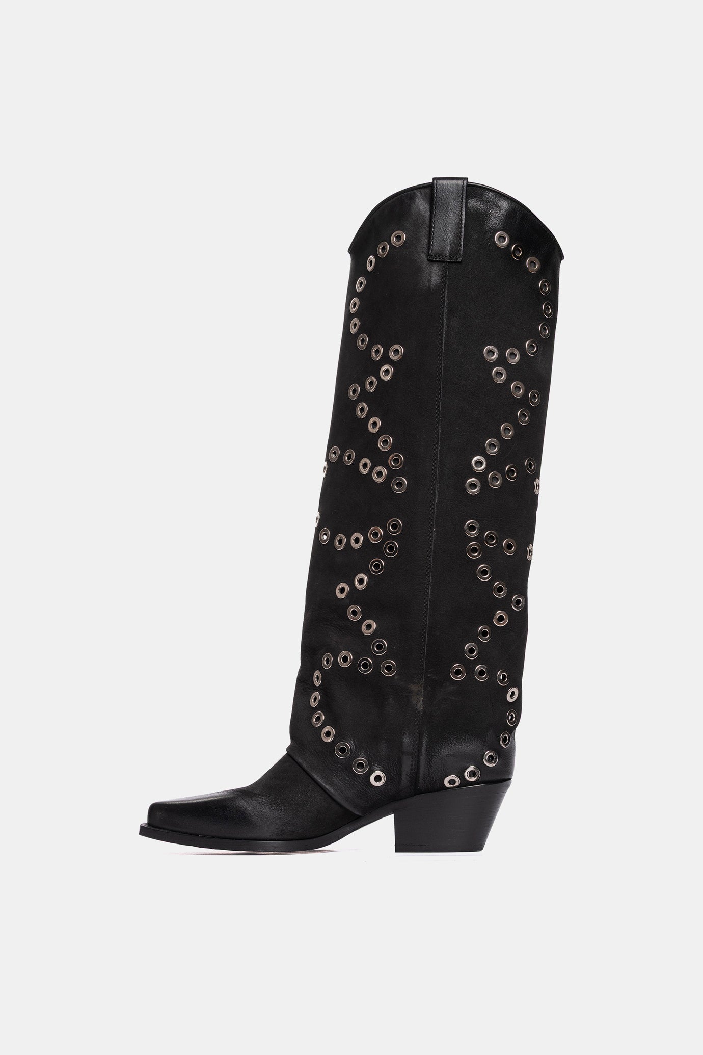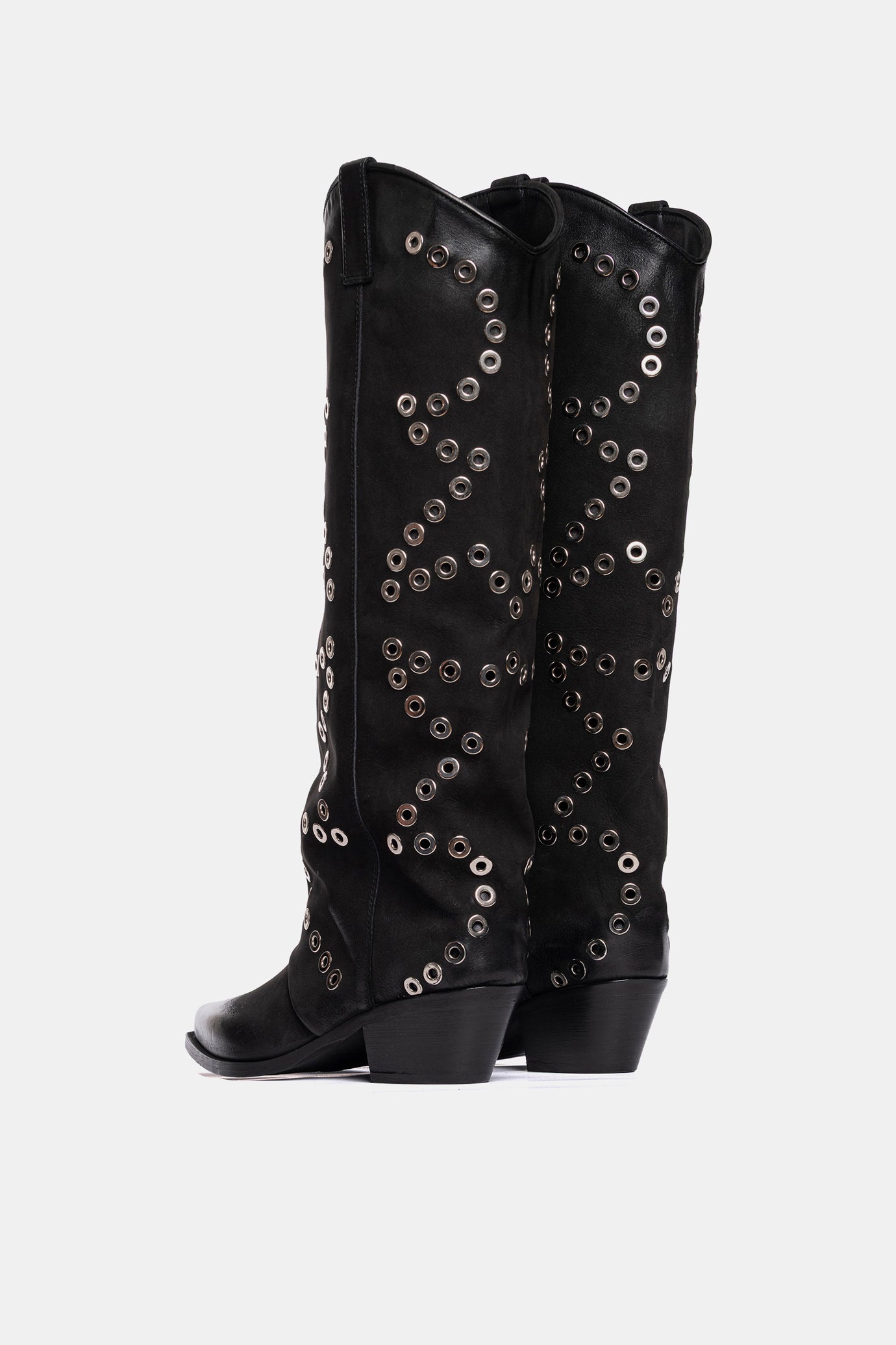 Stivali texani in vitello nero con applicazioni ad occhielli.