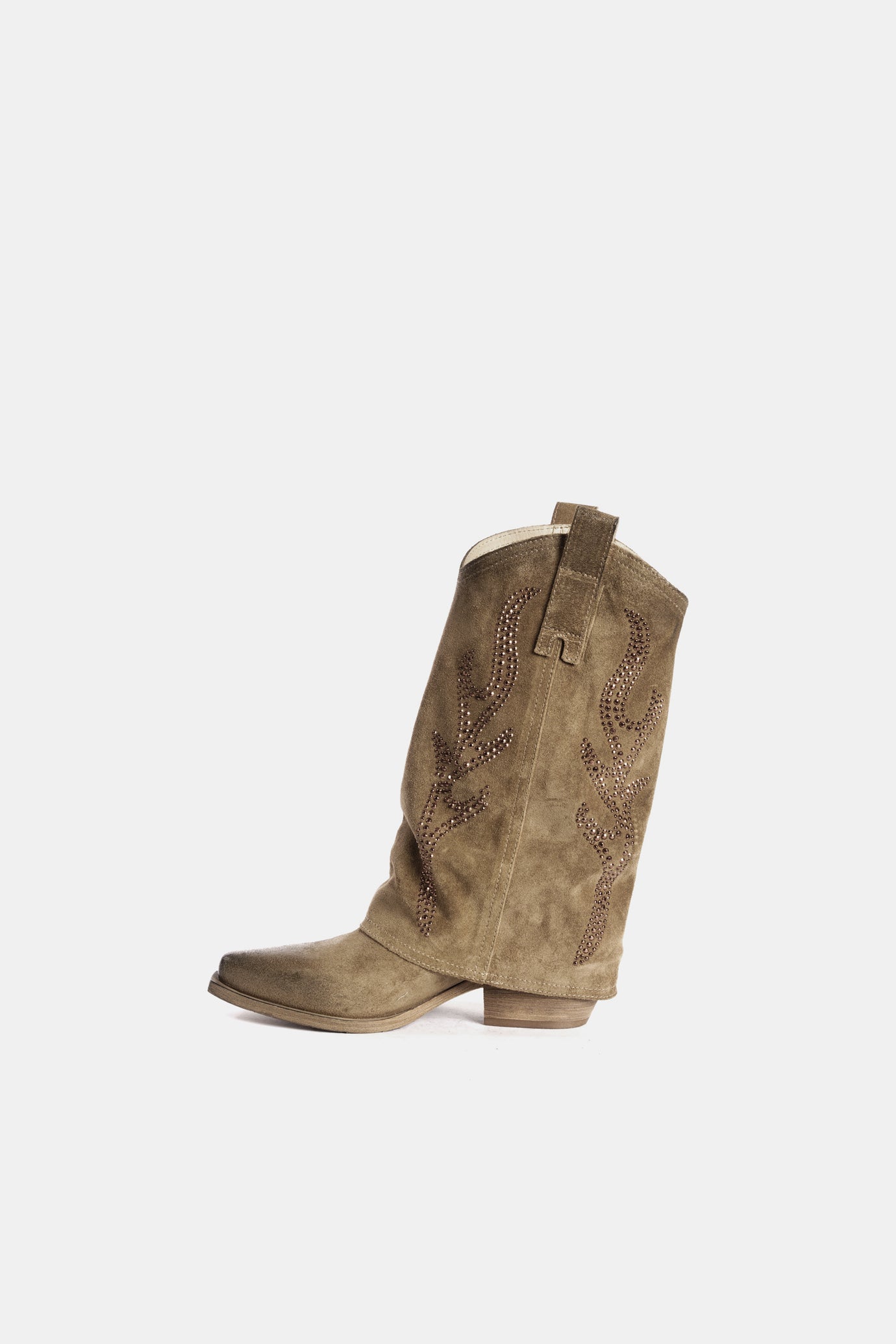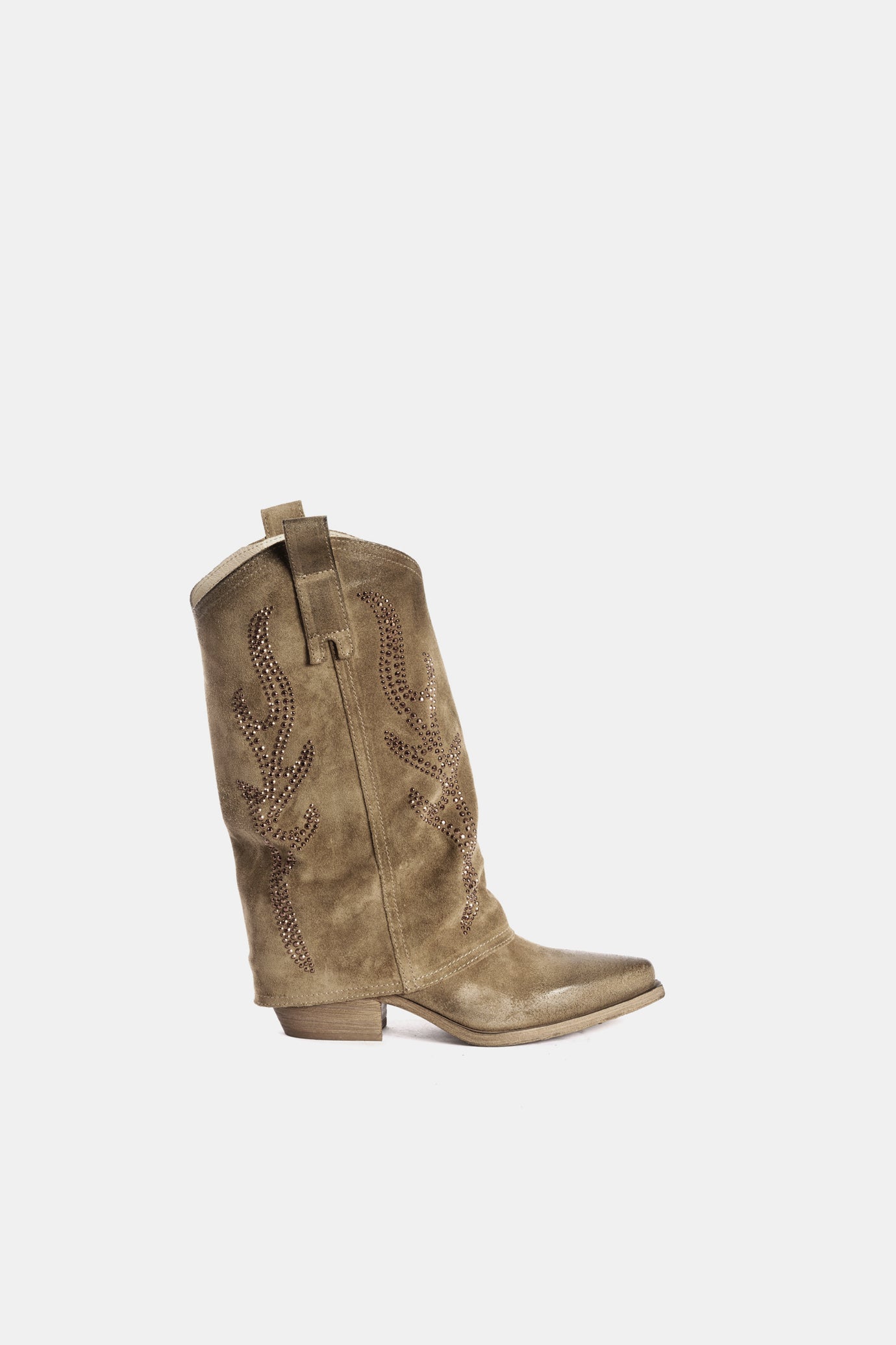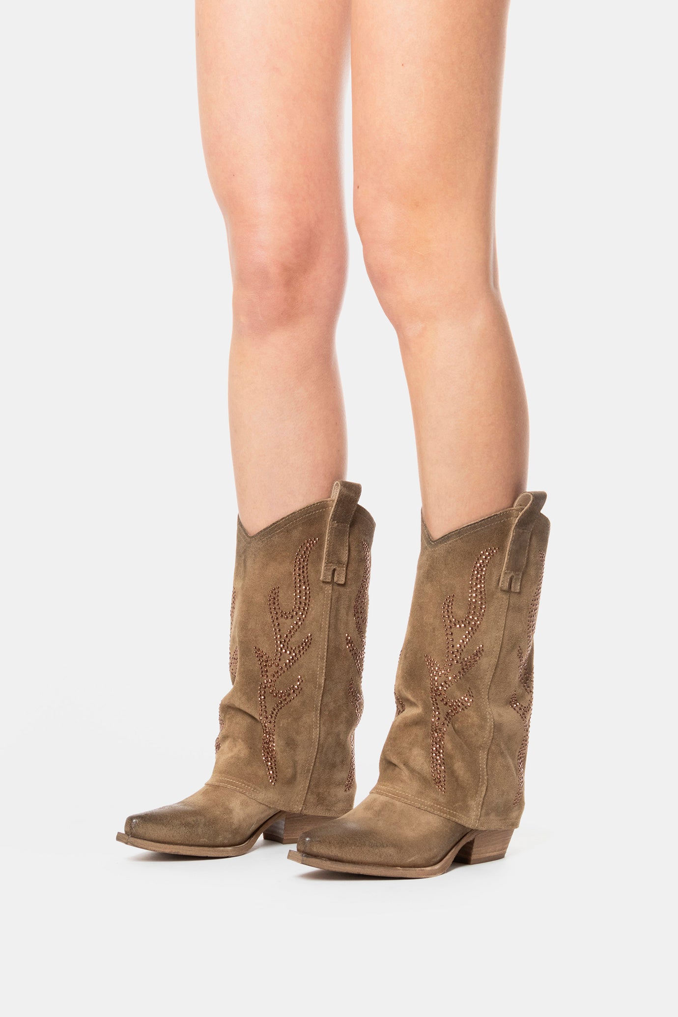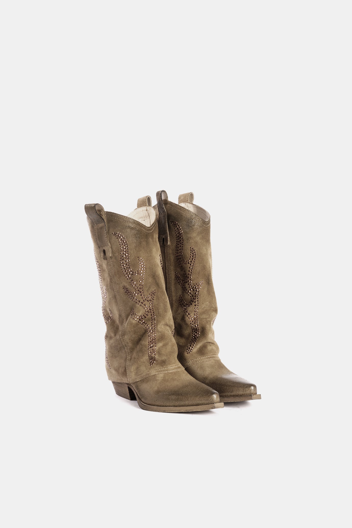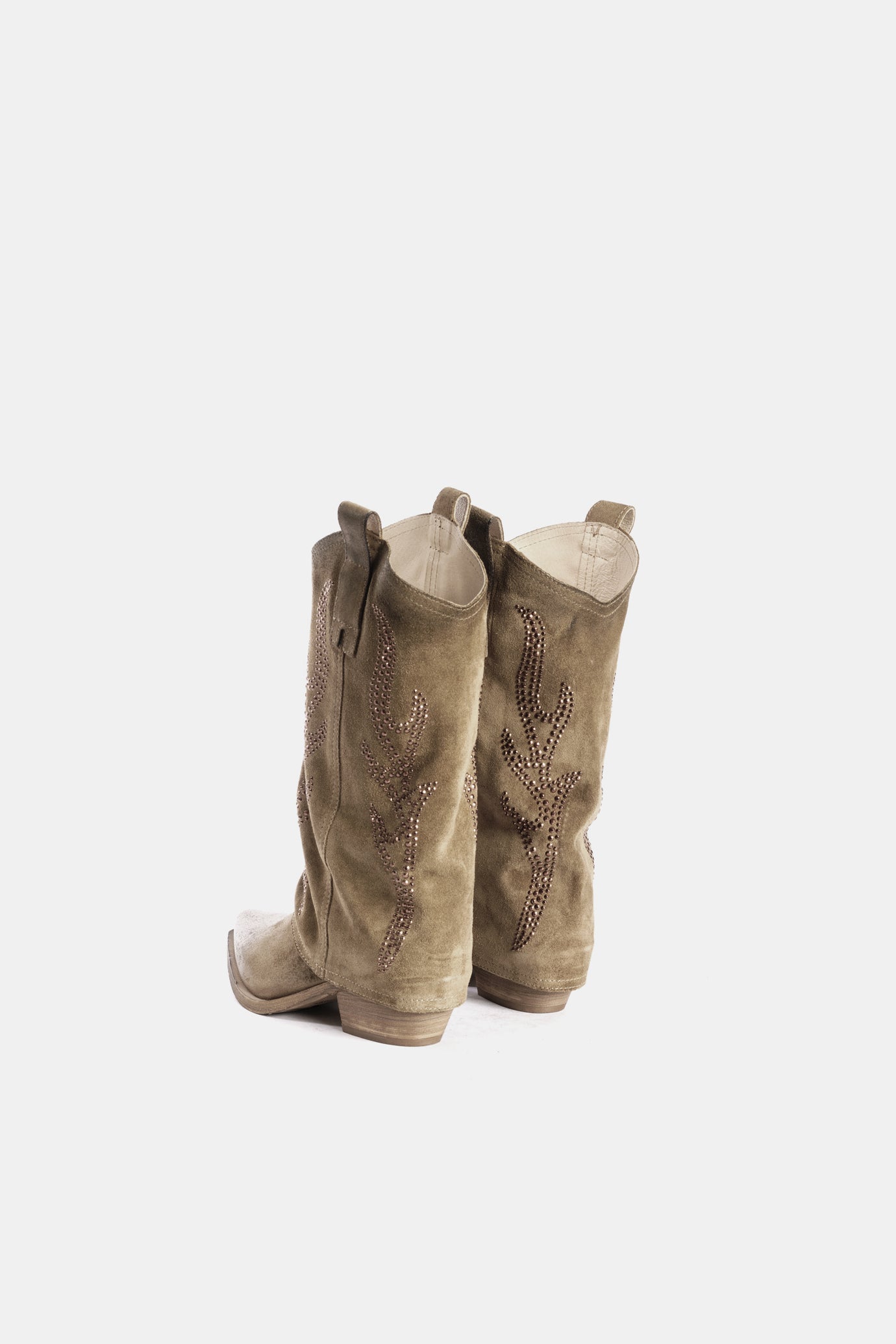 Texan boots made of dove-grey suede with shaft embellished with studs.