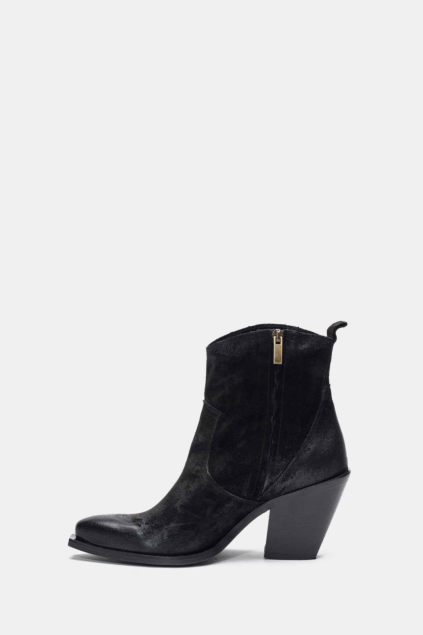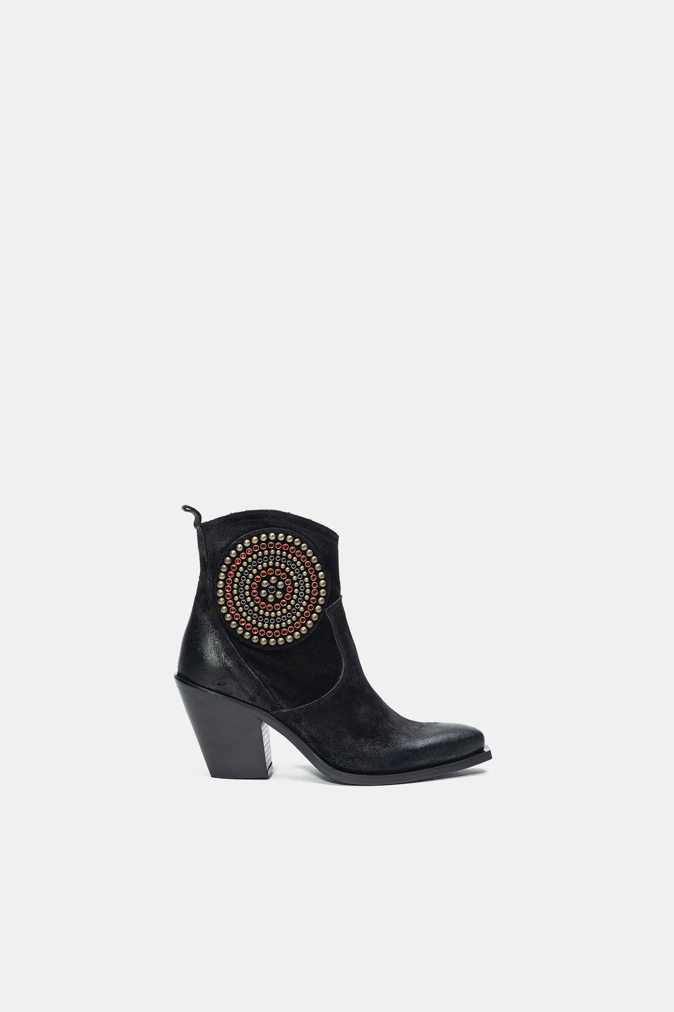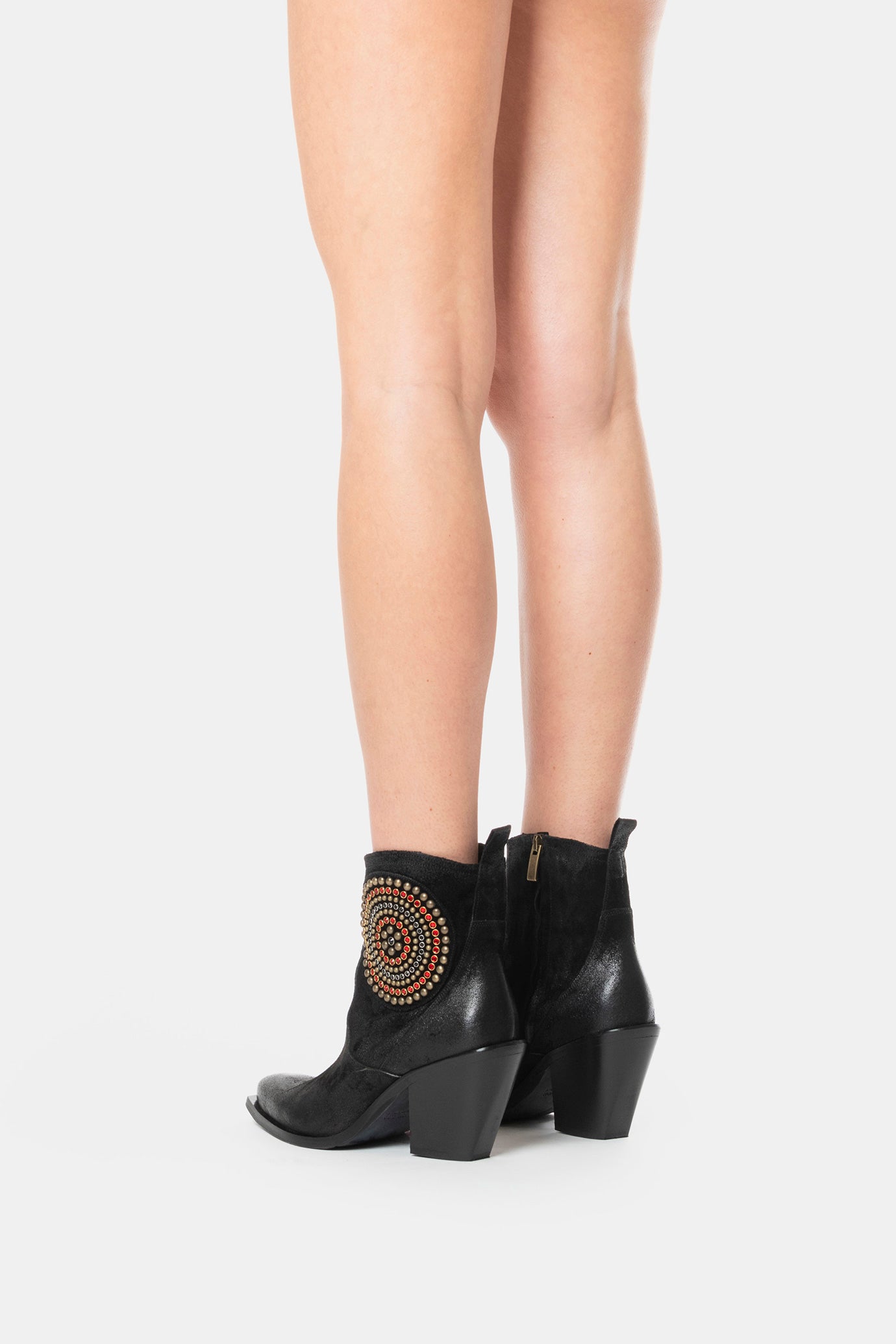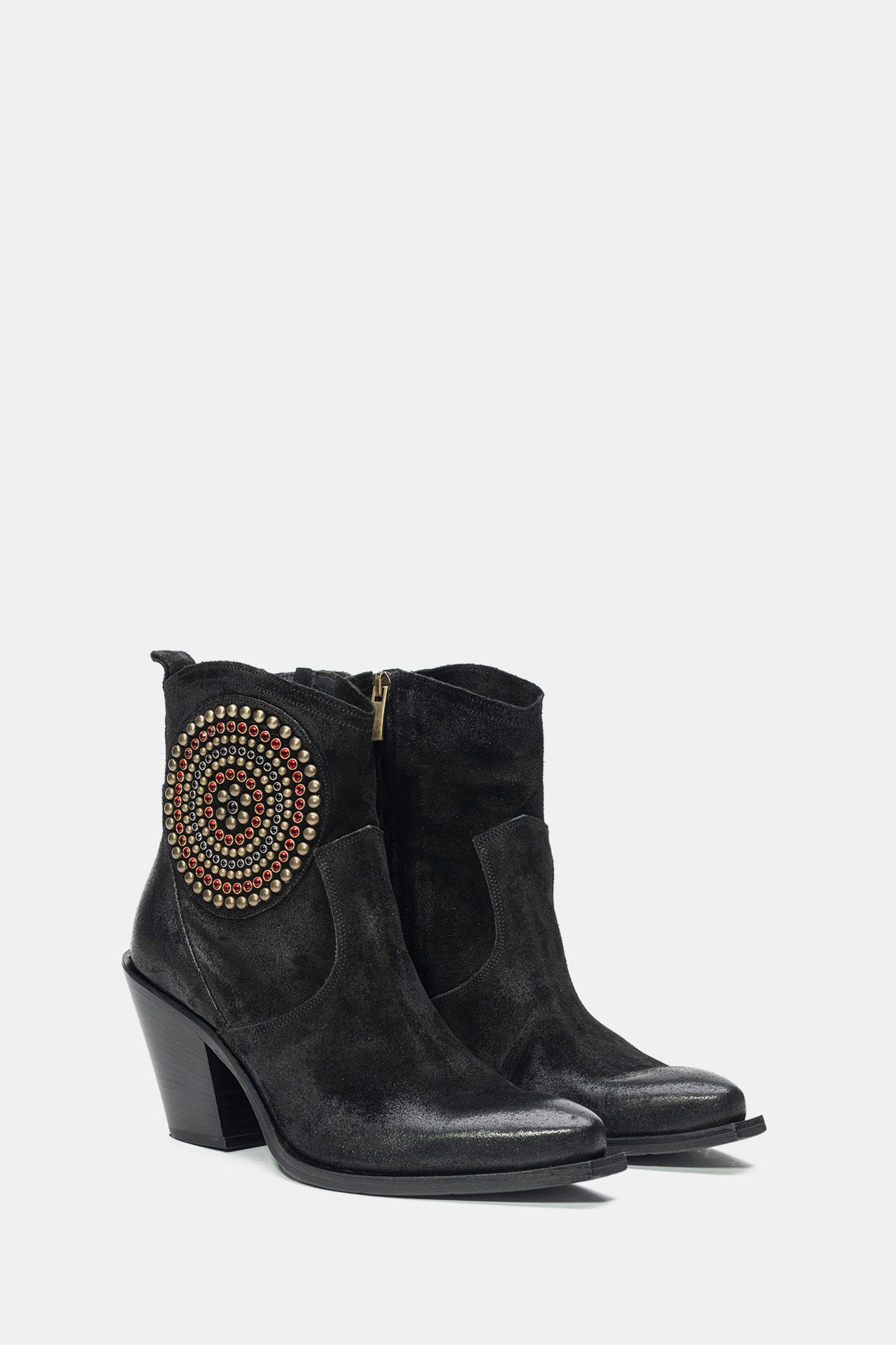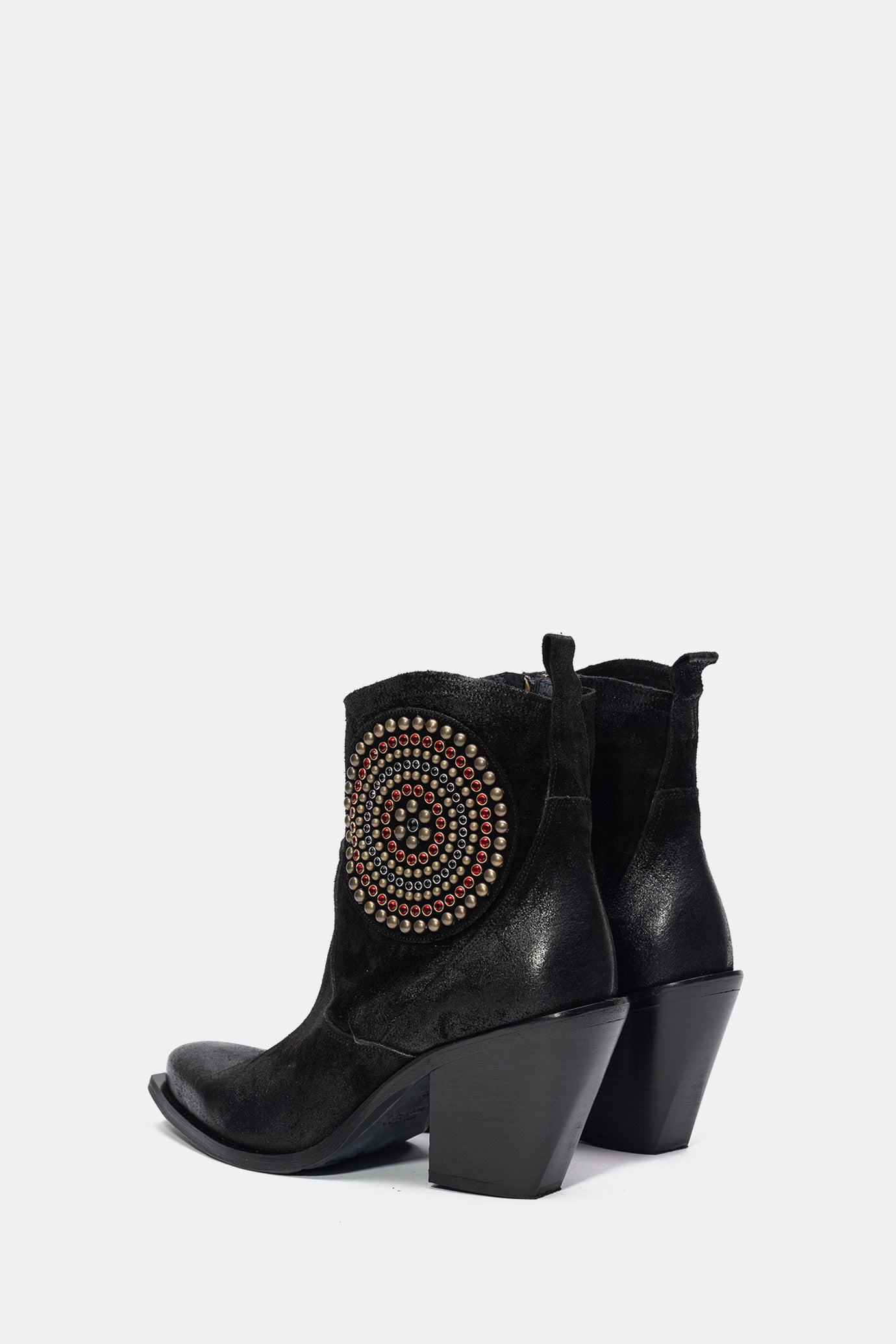 Texan ankle boots made with soft materials and completely brushed and aged by hand. Embellished with studs and colored stones