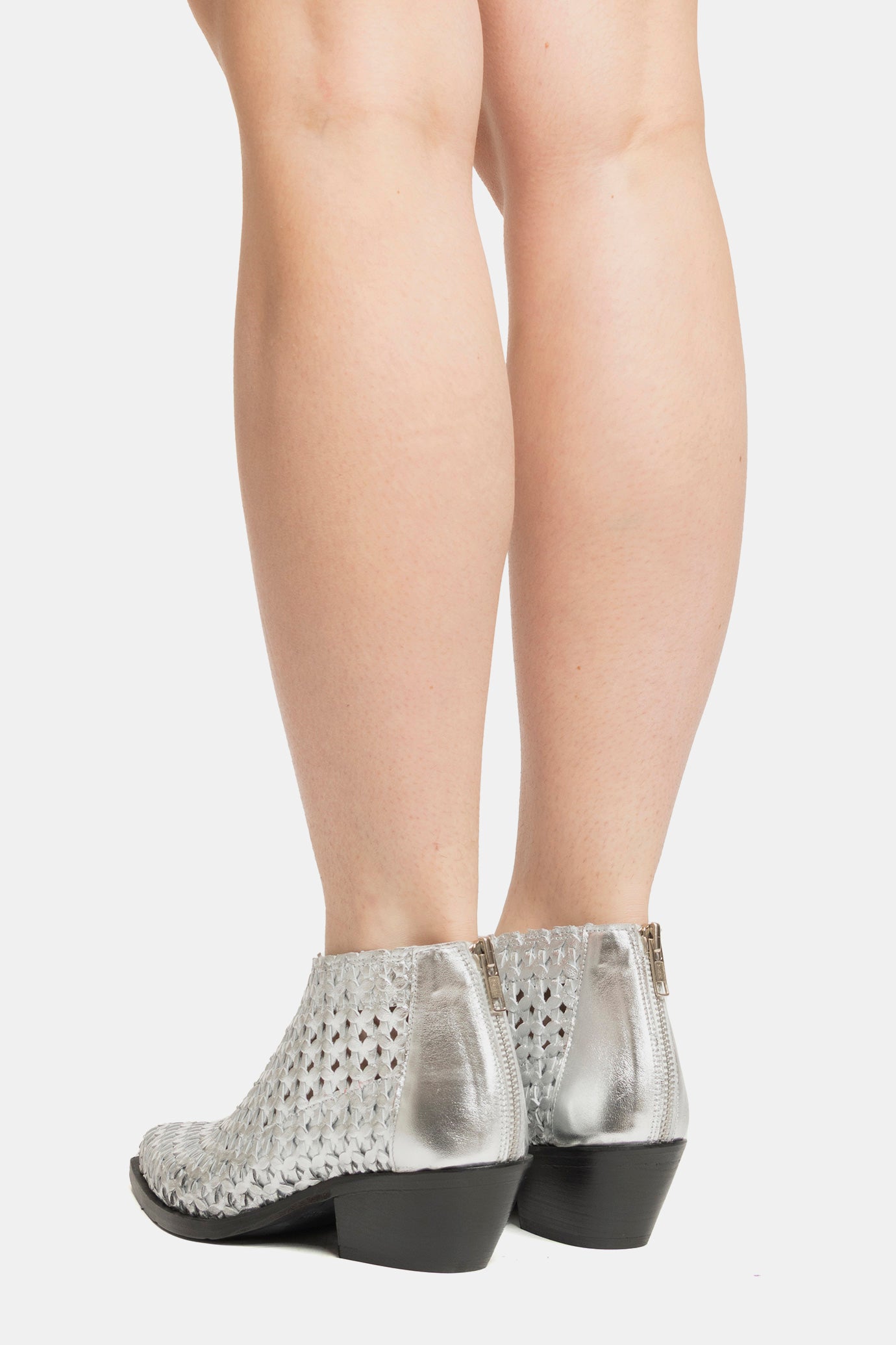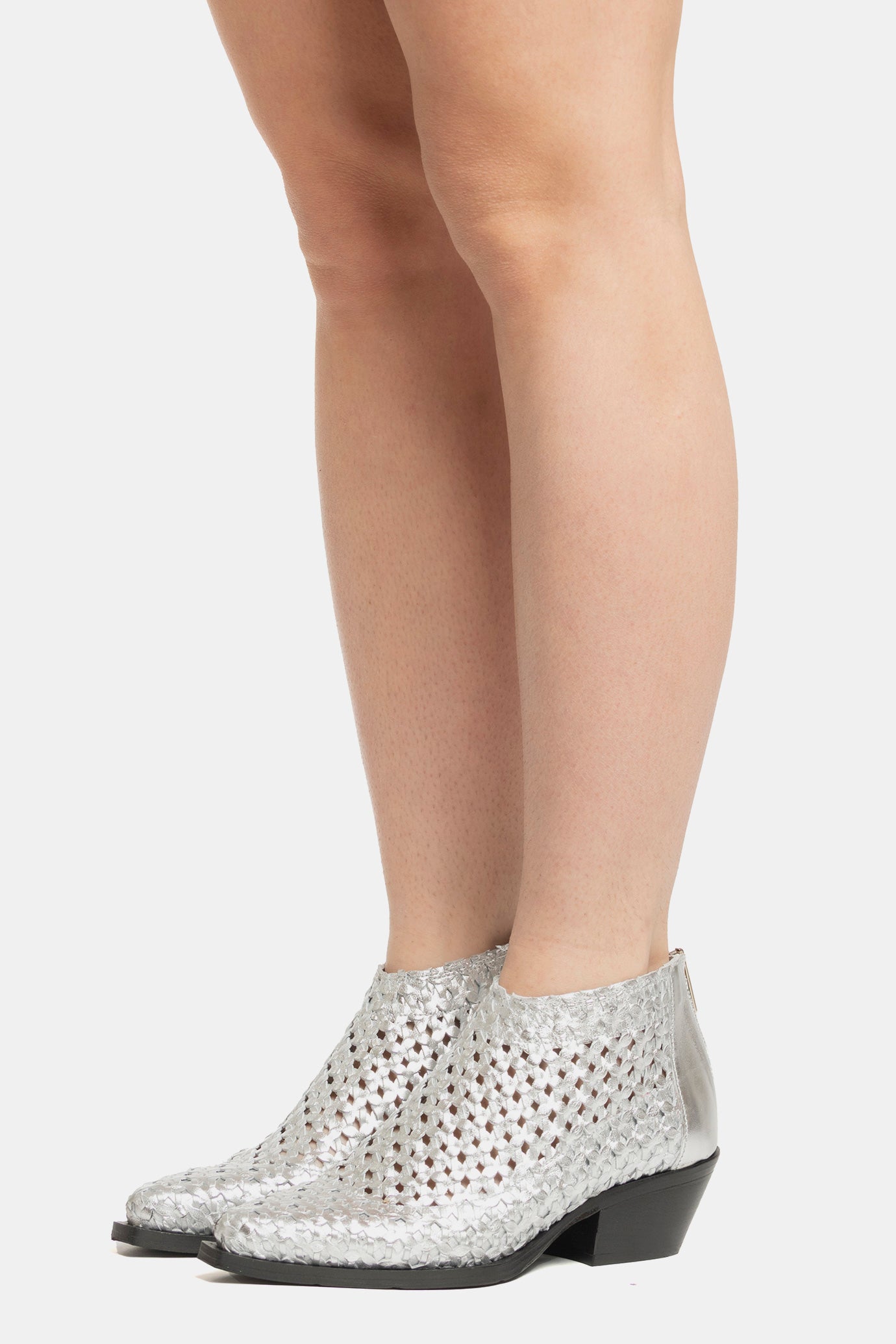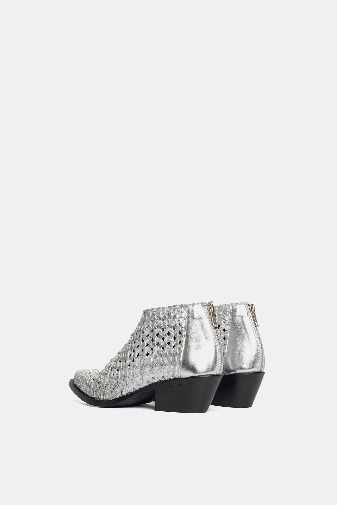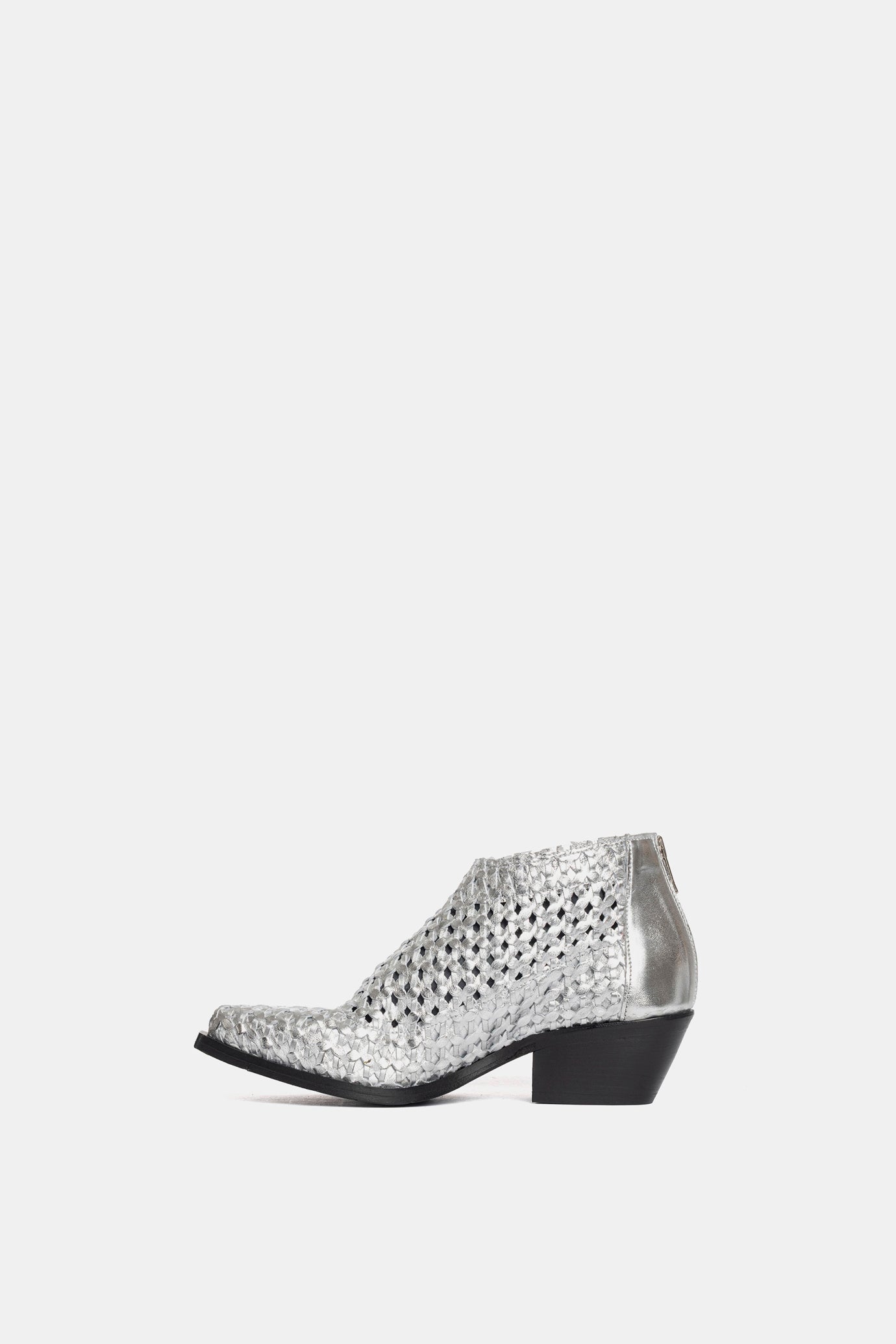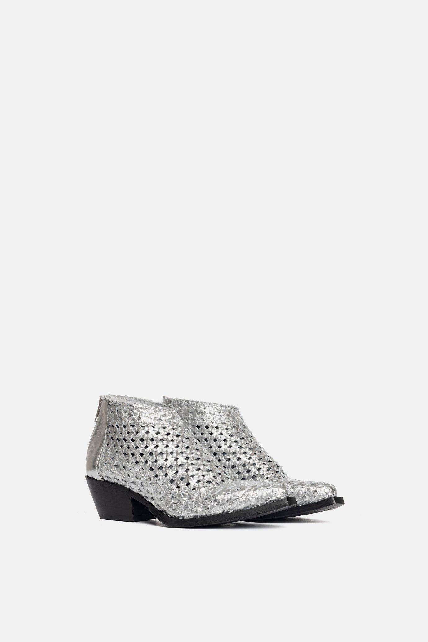 Silver laminated Texan ankle boots. Upper entirely hand-woven.