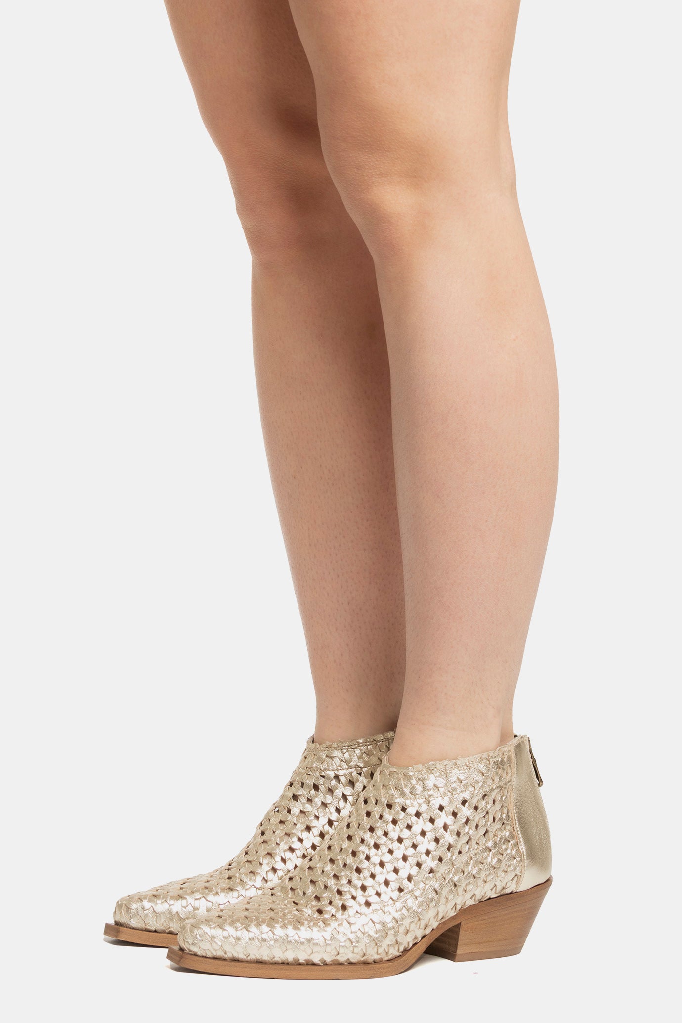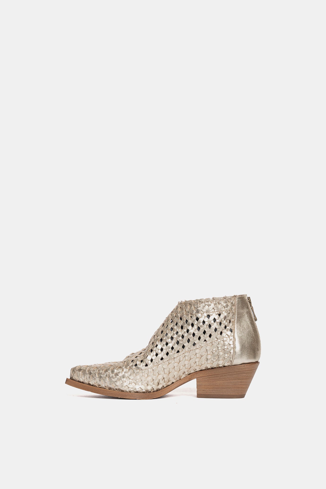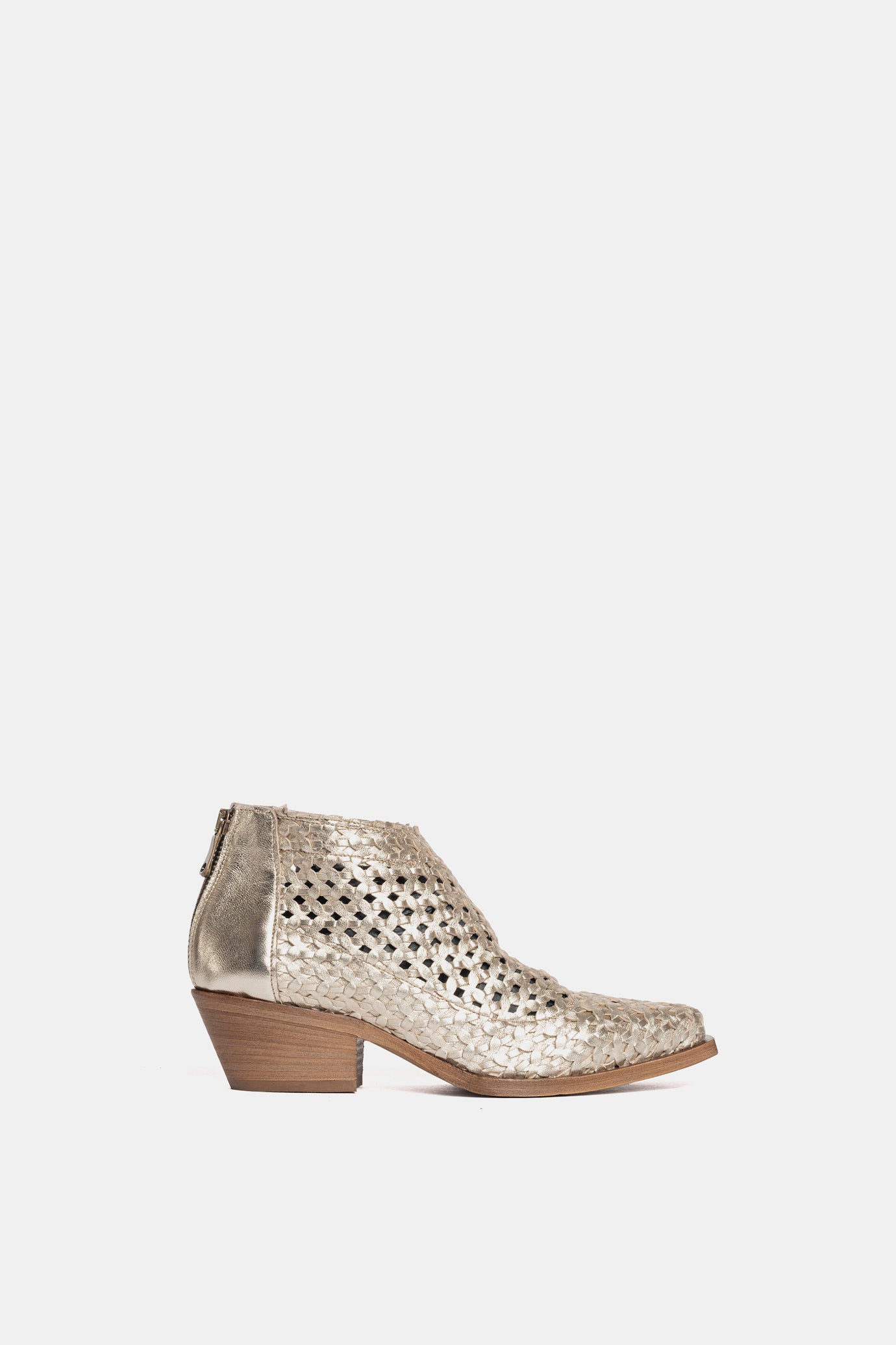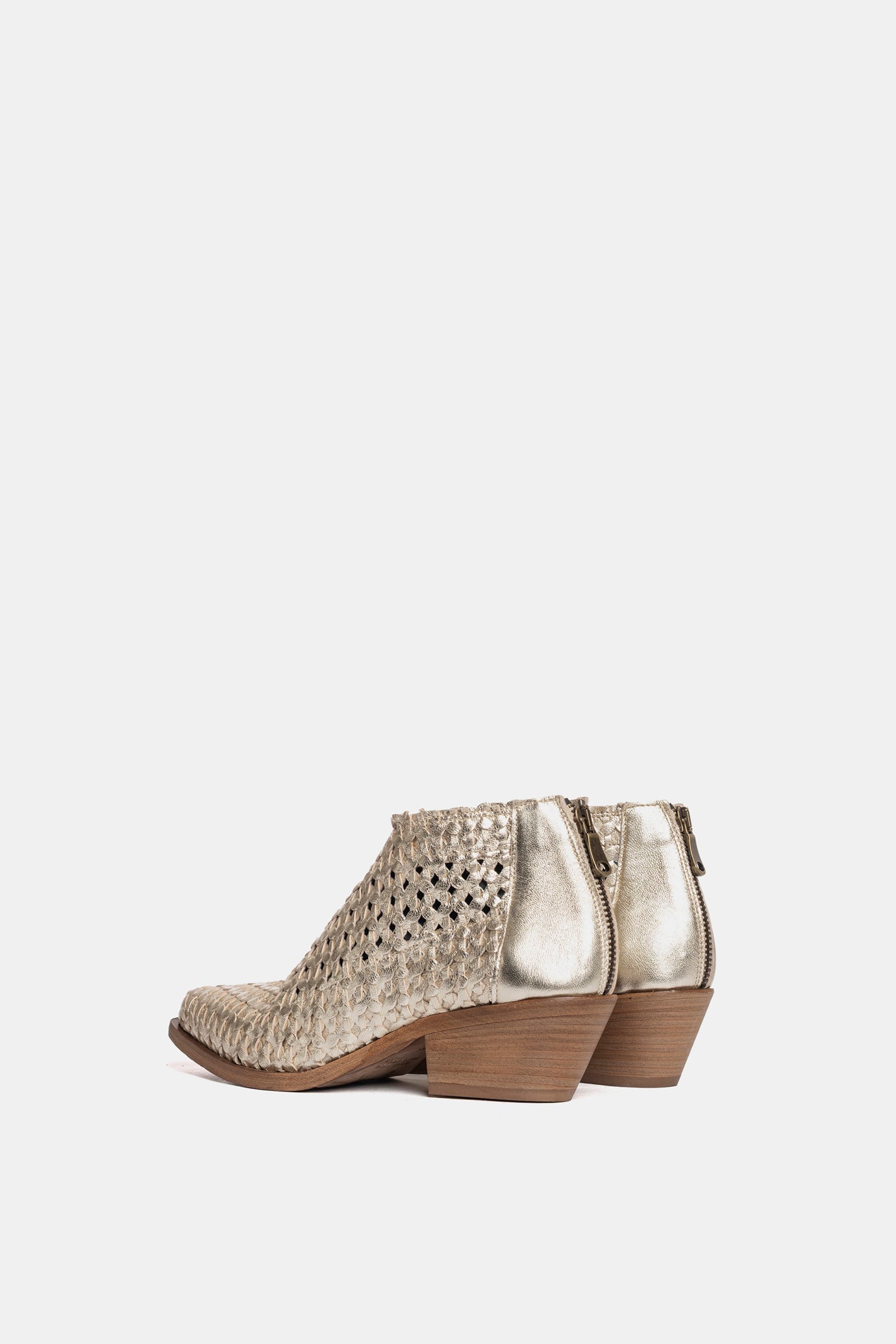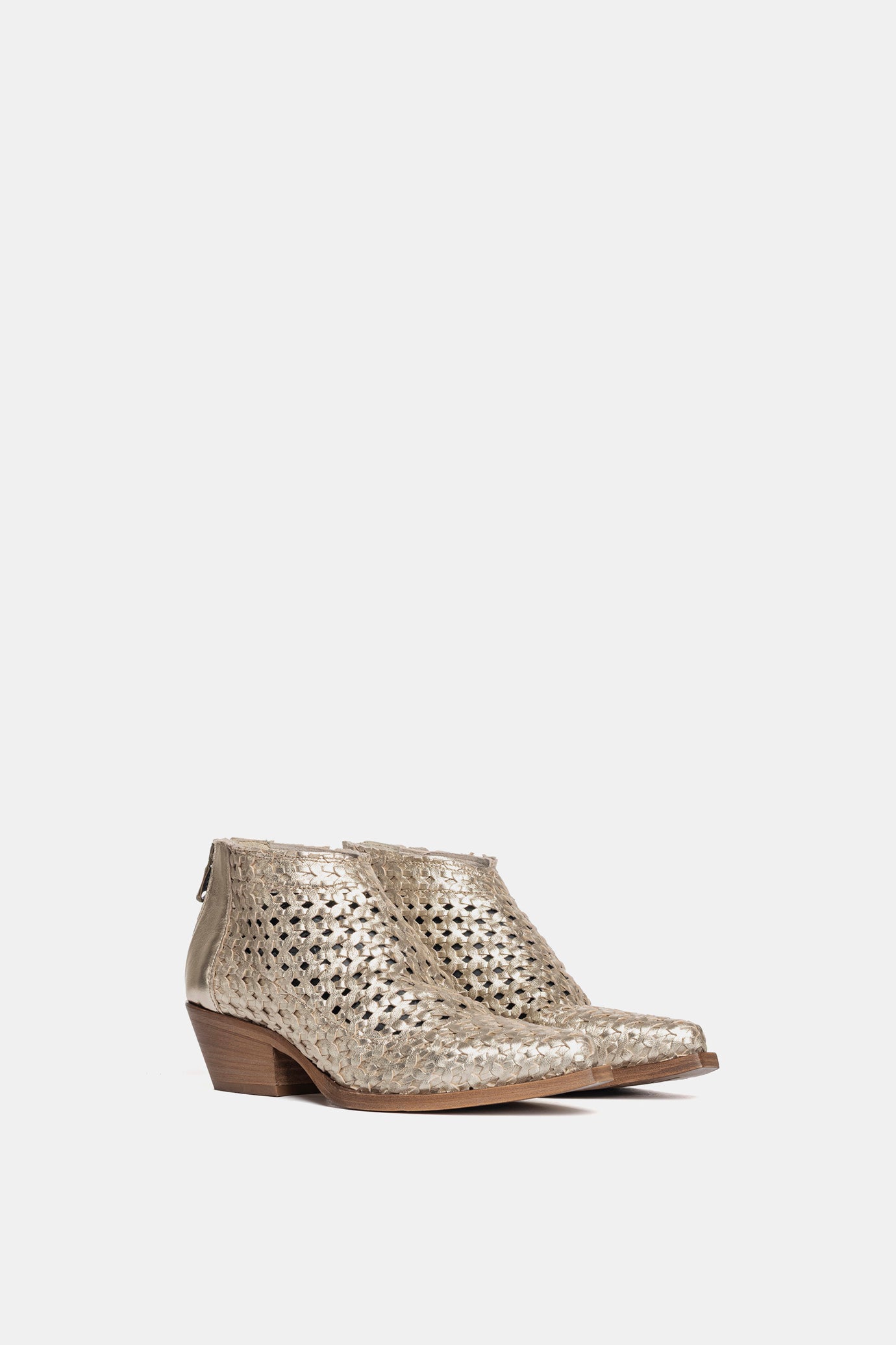 Texan ankle boots in platinum laminate. Upper entirely hand-woven.