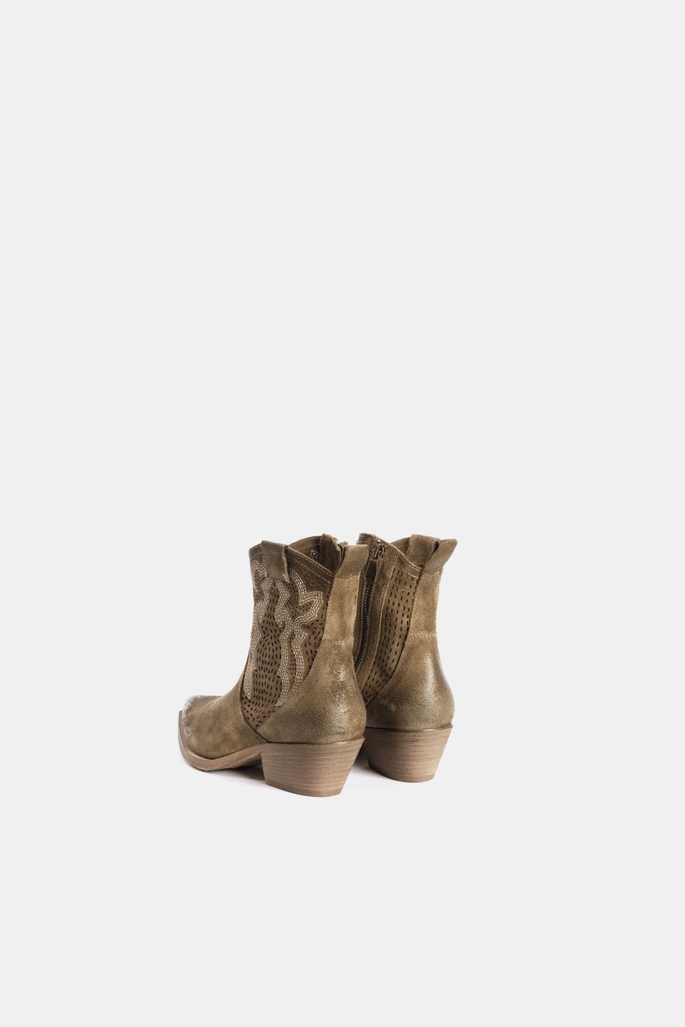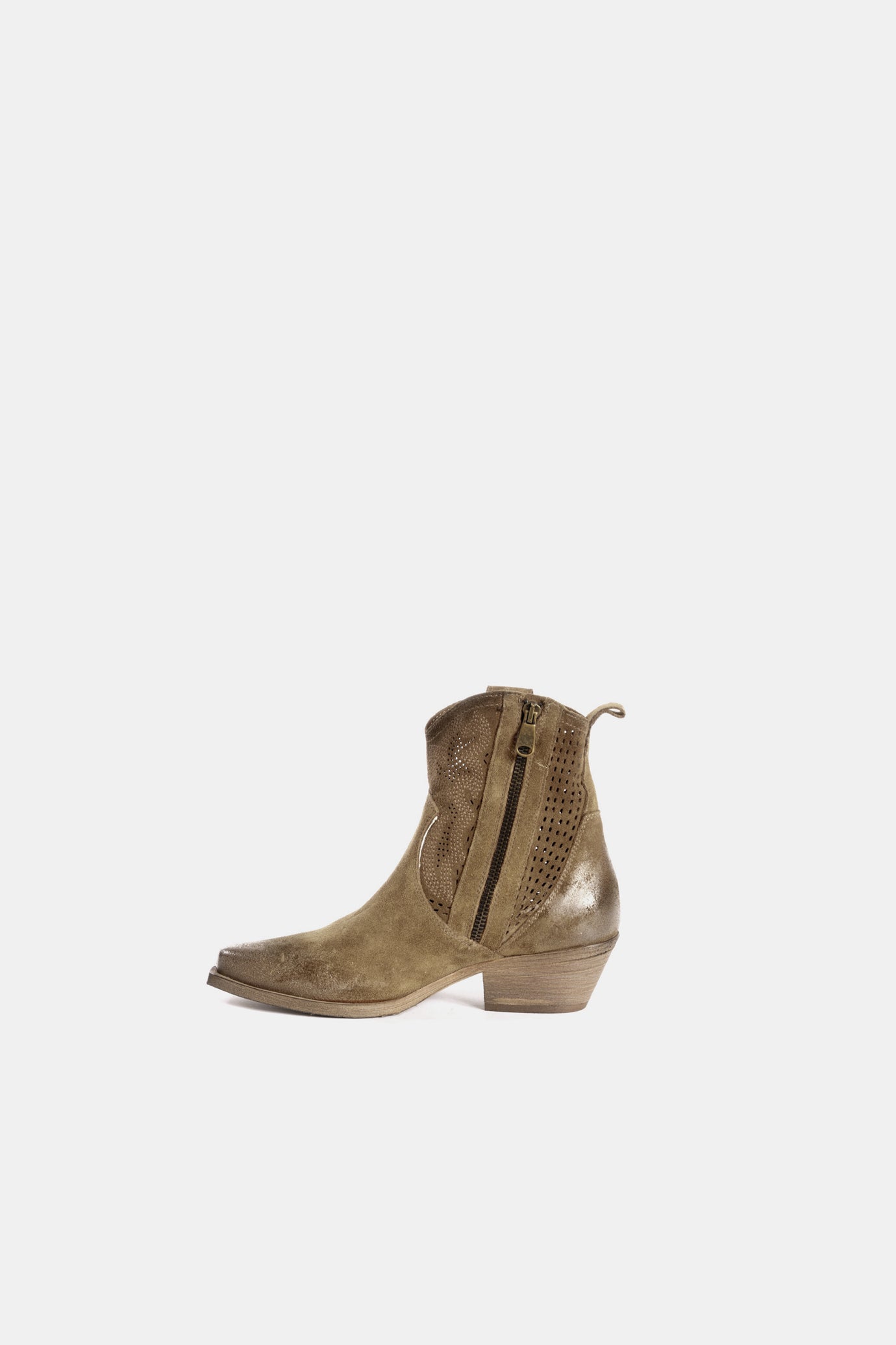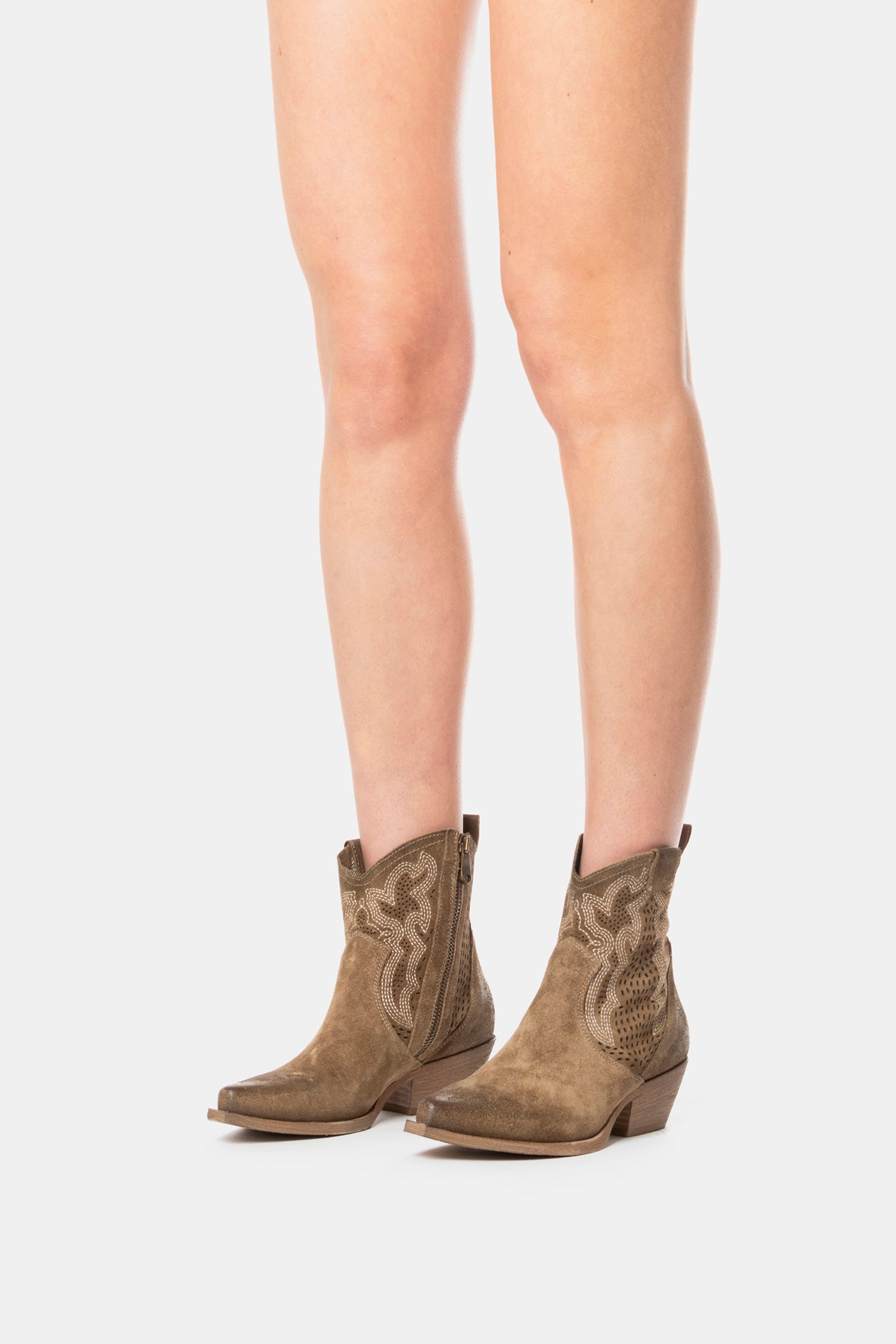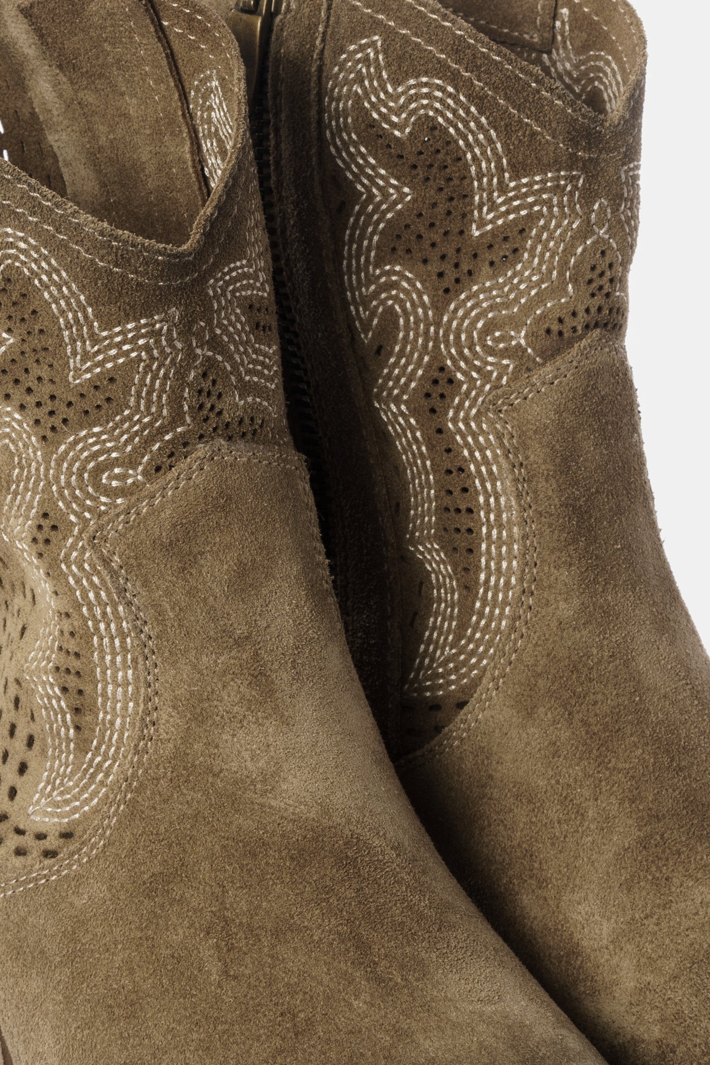 Dove grey suede Texan ankle boots with perforations and embroidery
