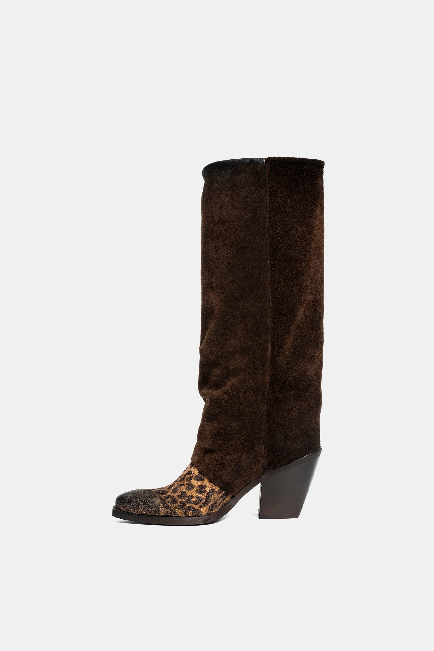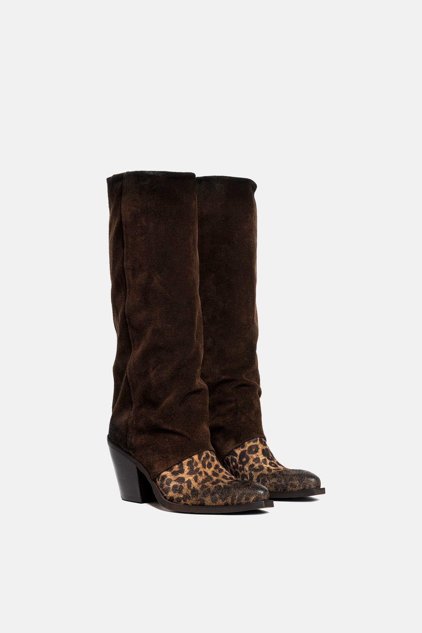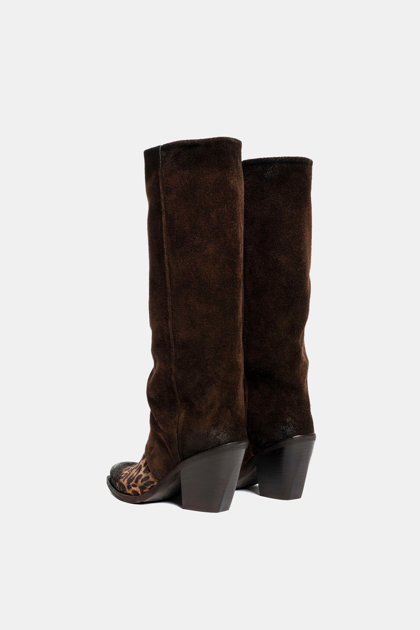 Bottes texanes en daim marron foncé avec bout en cuir tacheté