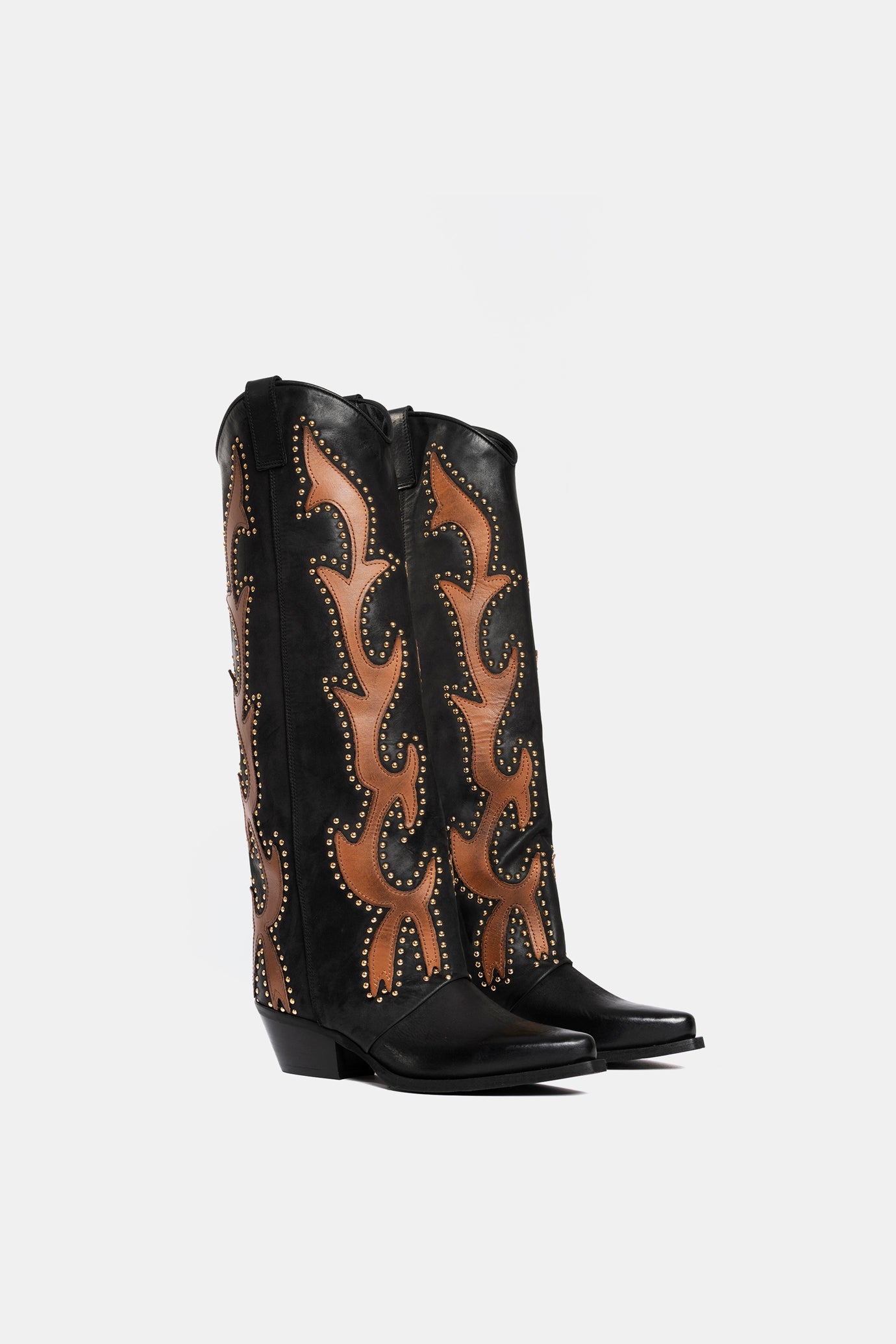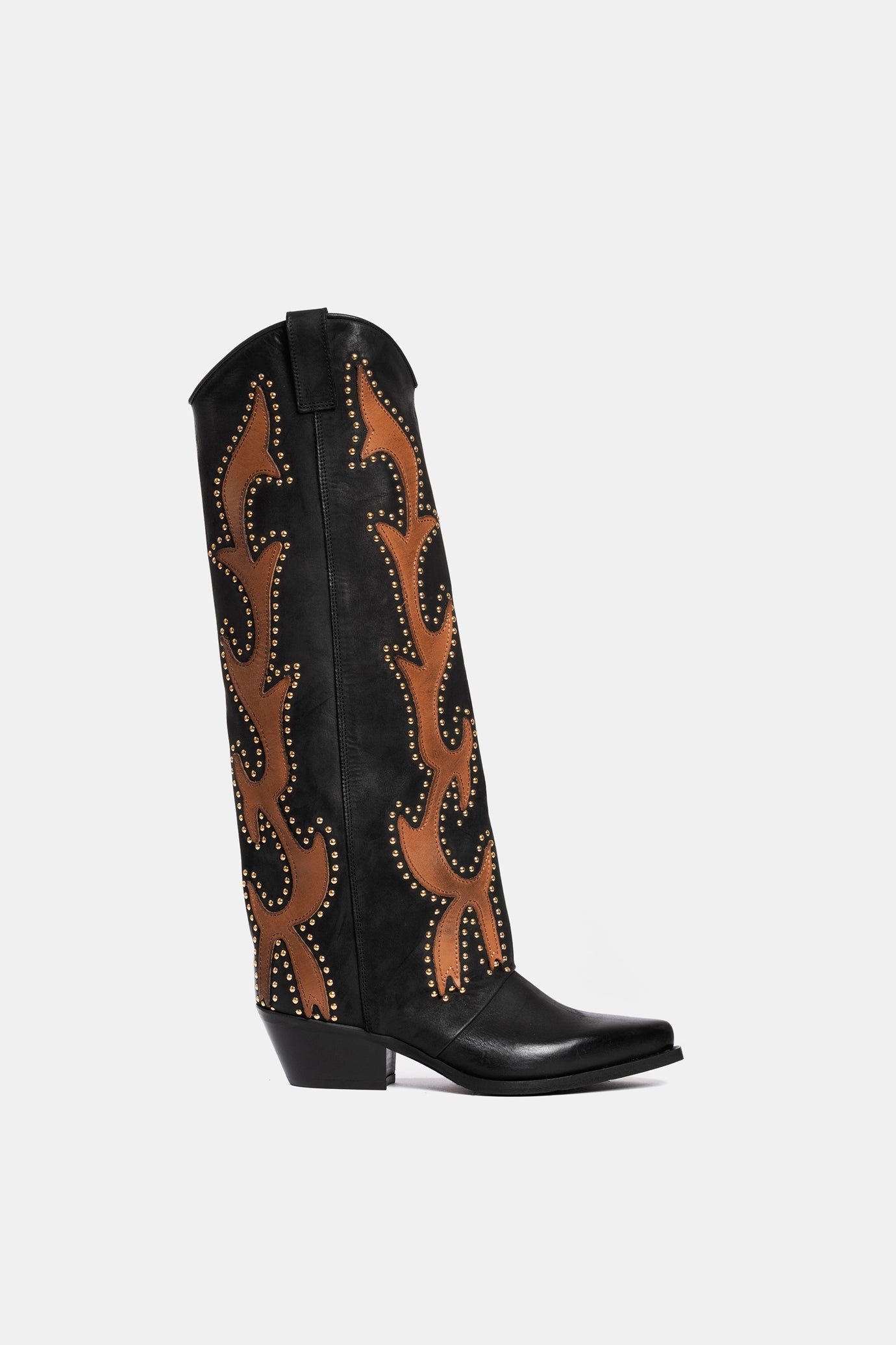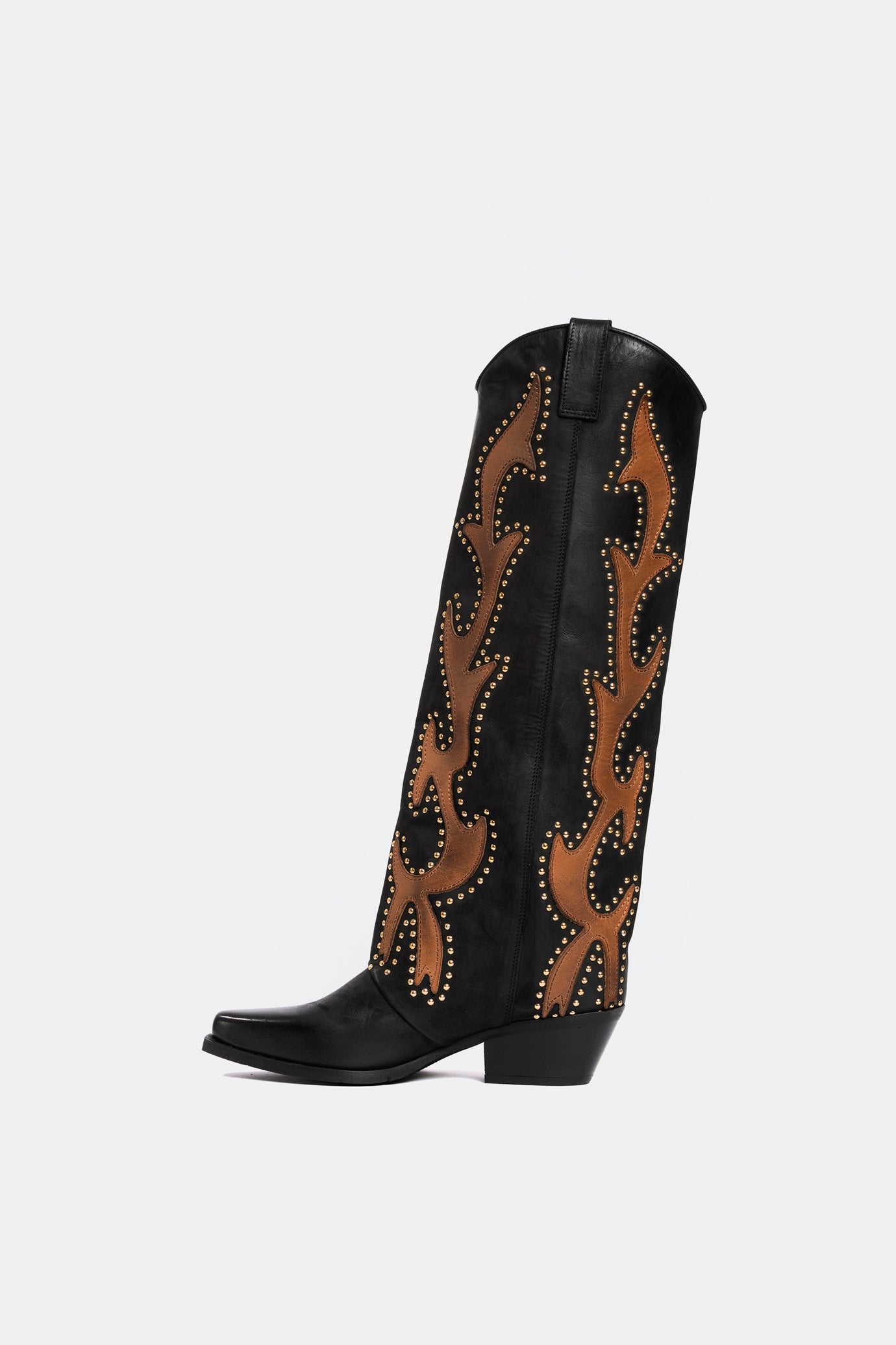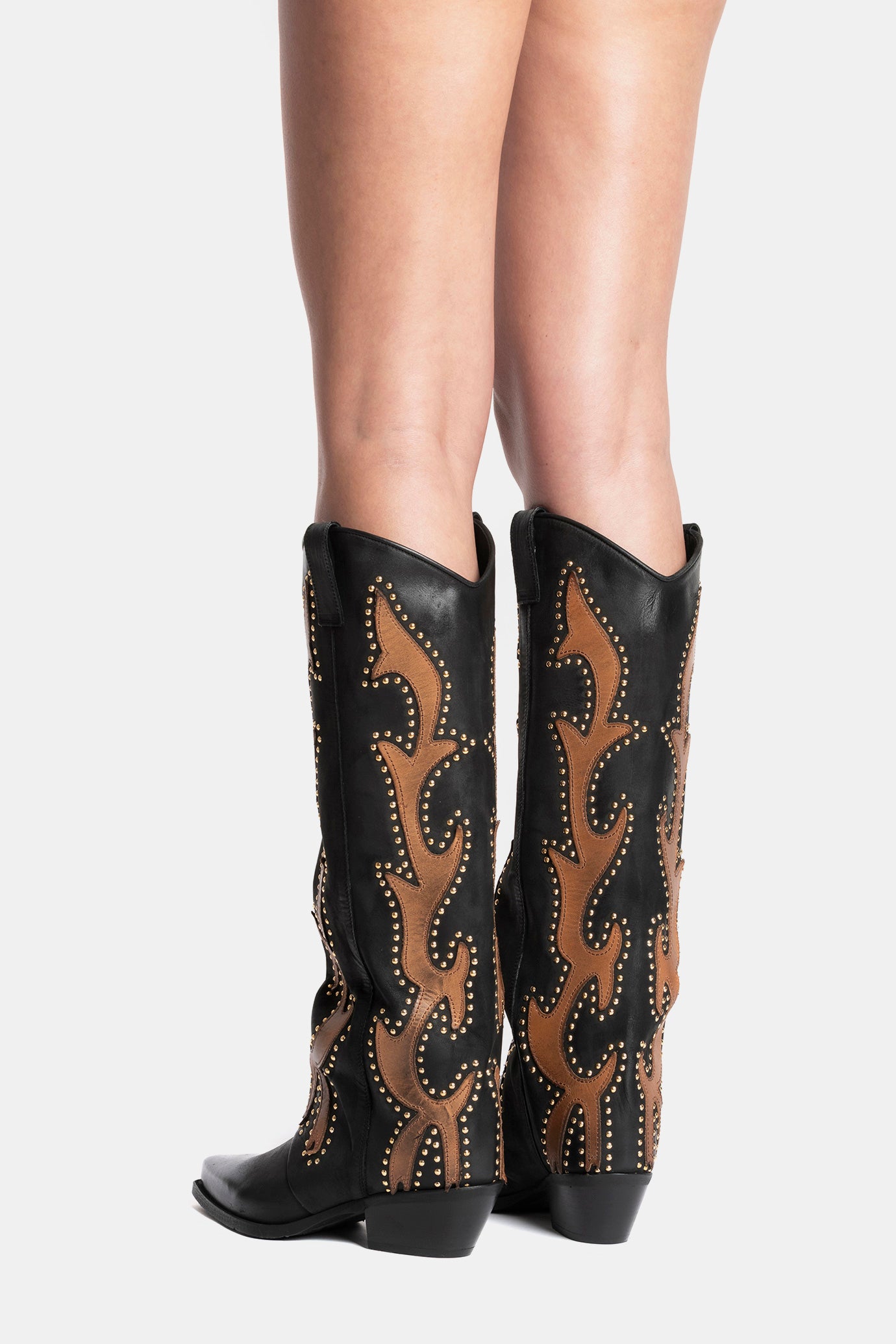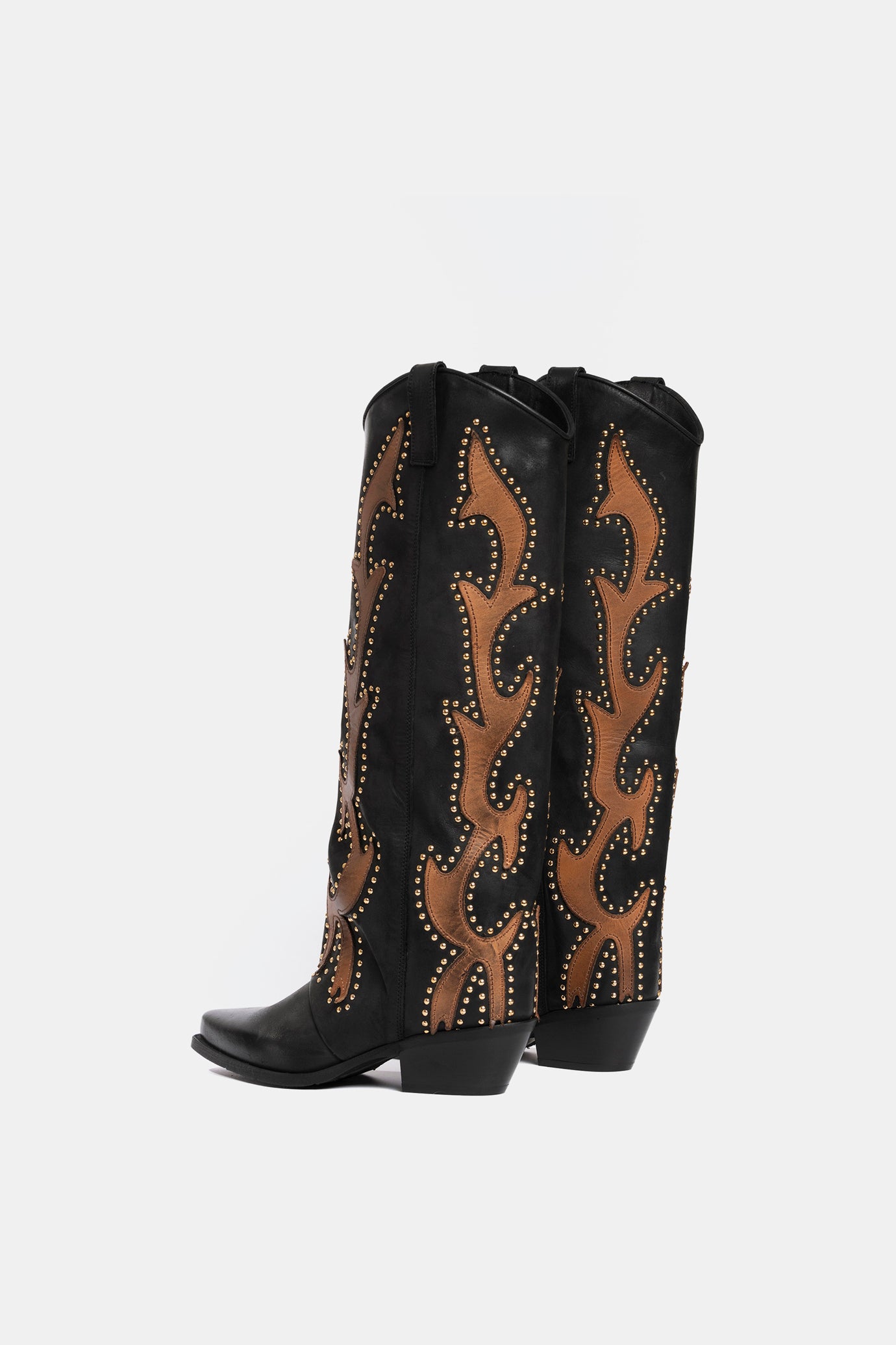 Bottes texanes en nubuck noir avec décorations en cuir et clous dorés