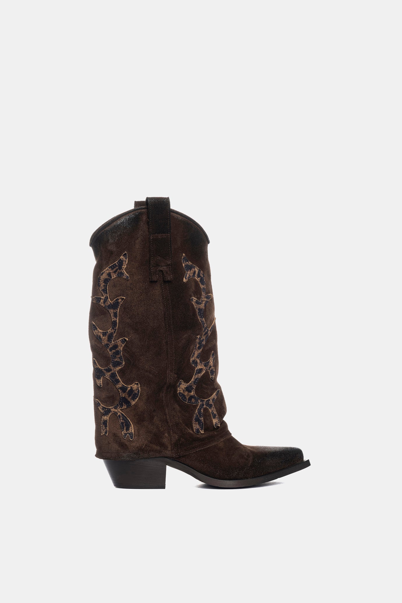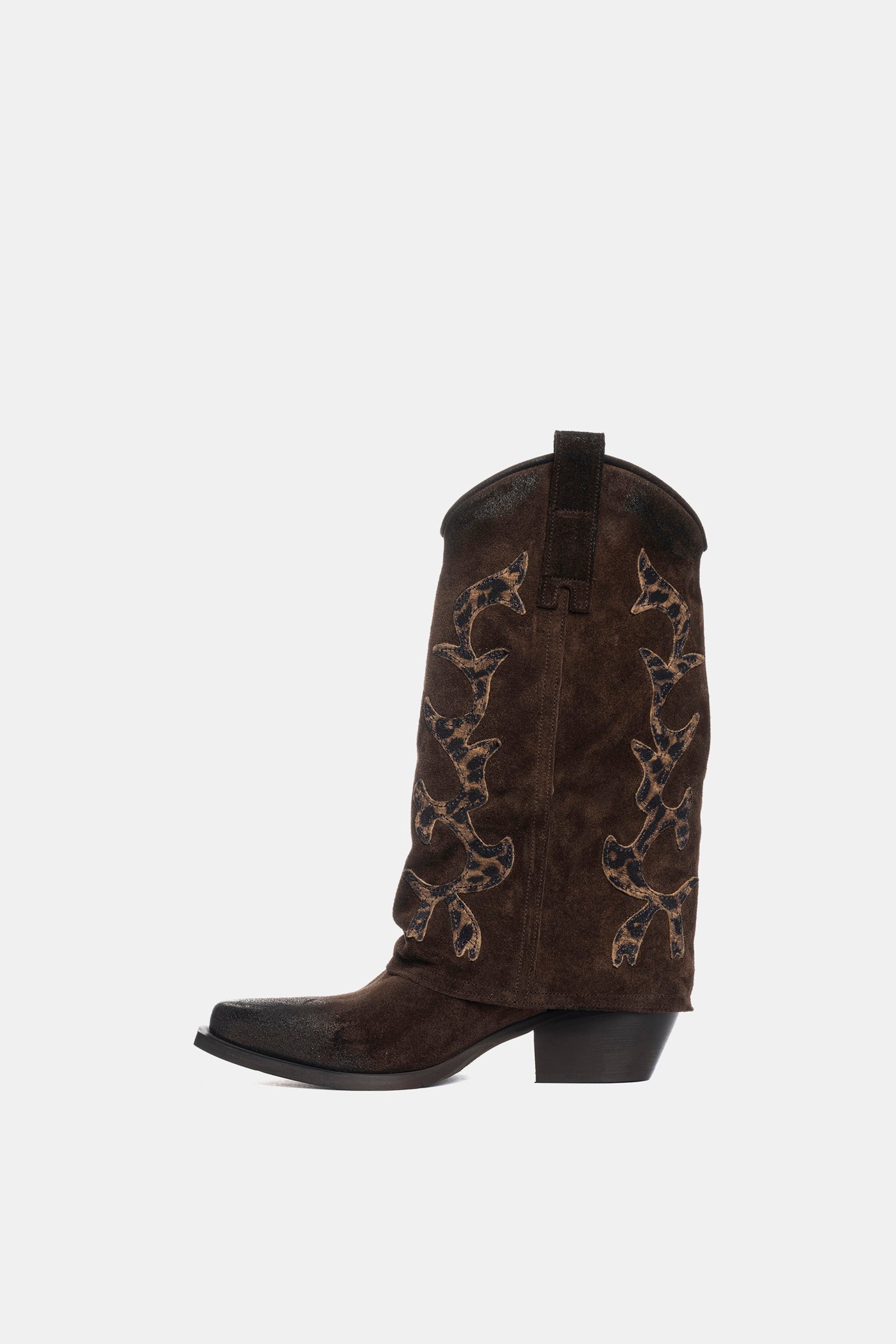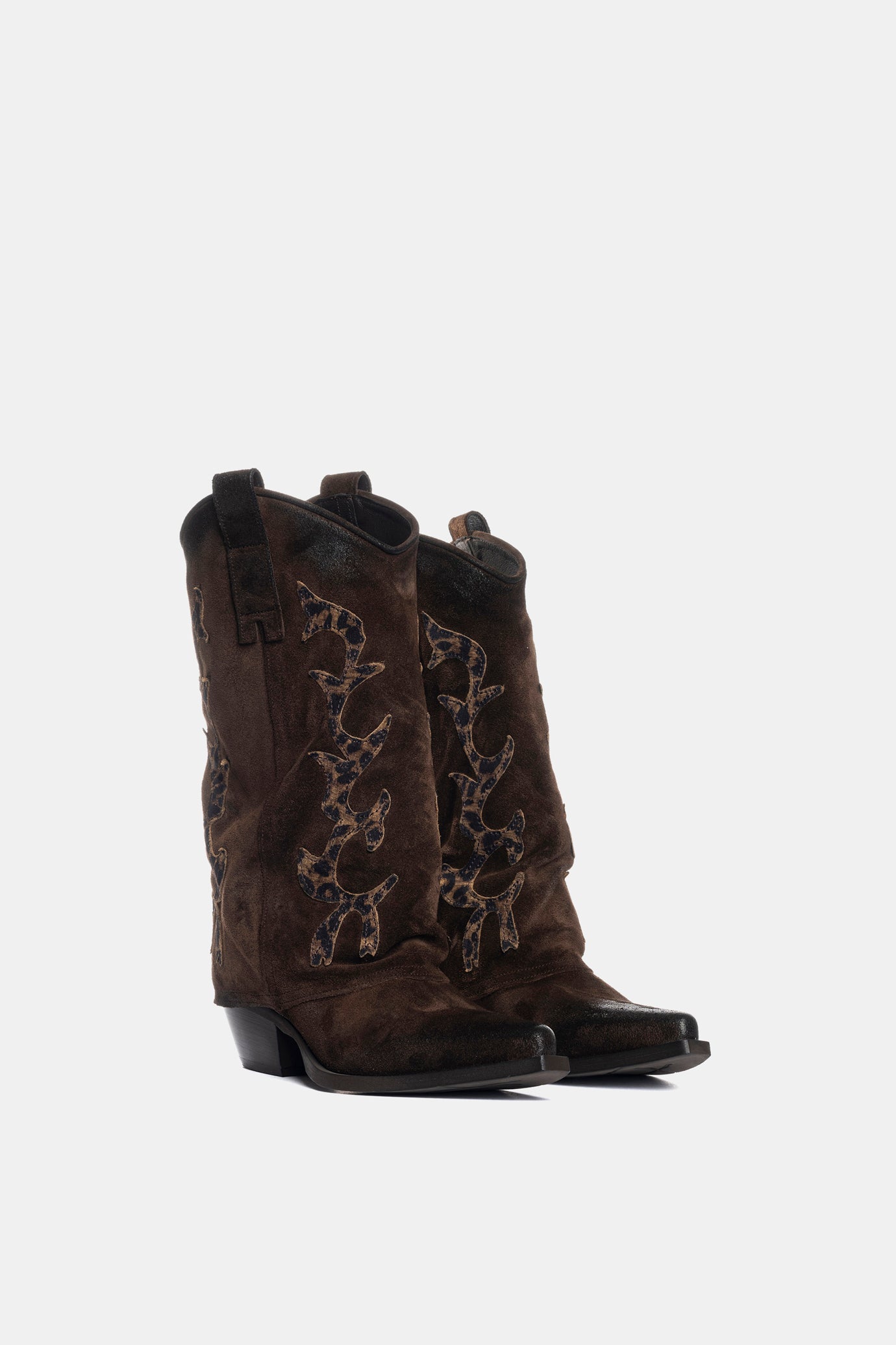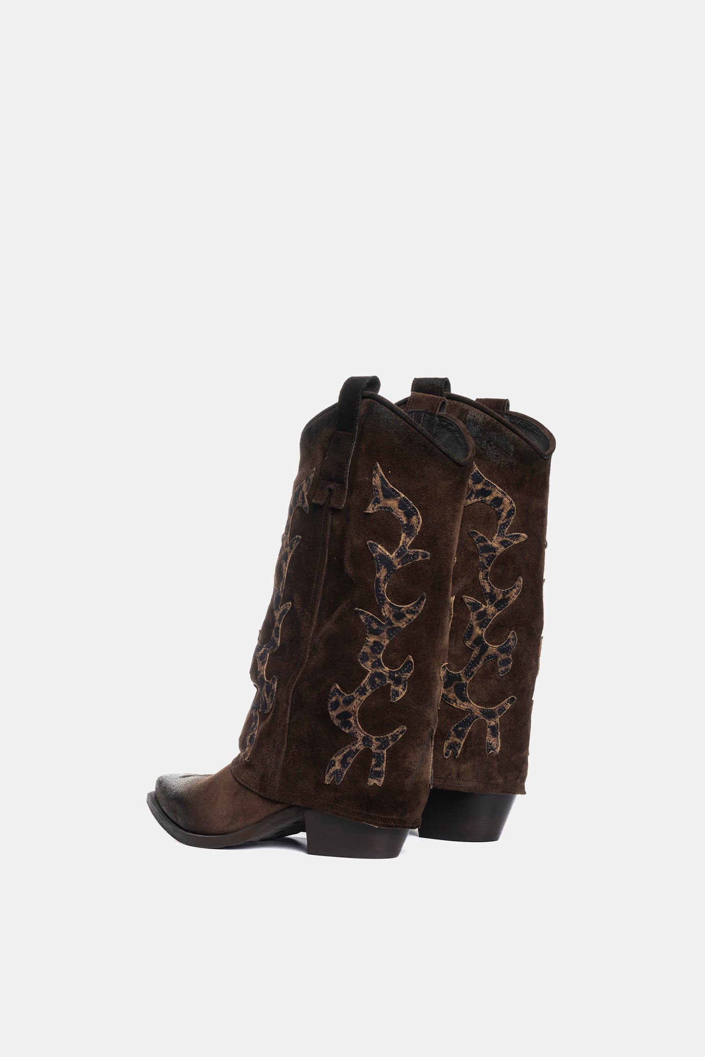 Bottes texanes en daim marron foncé avec applications en daim à pois
