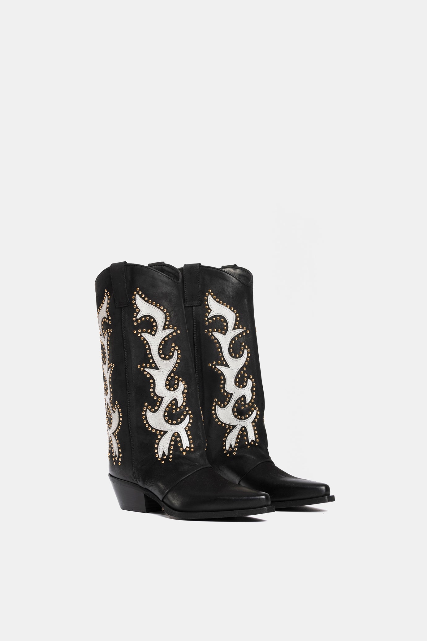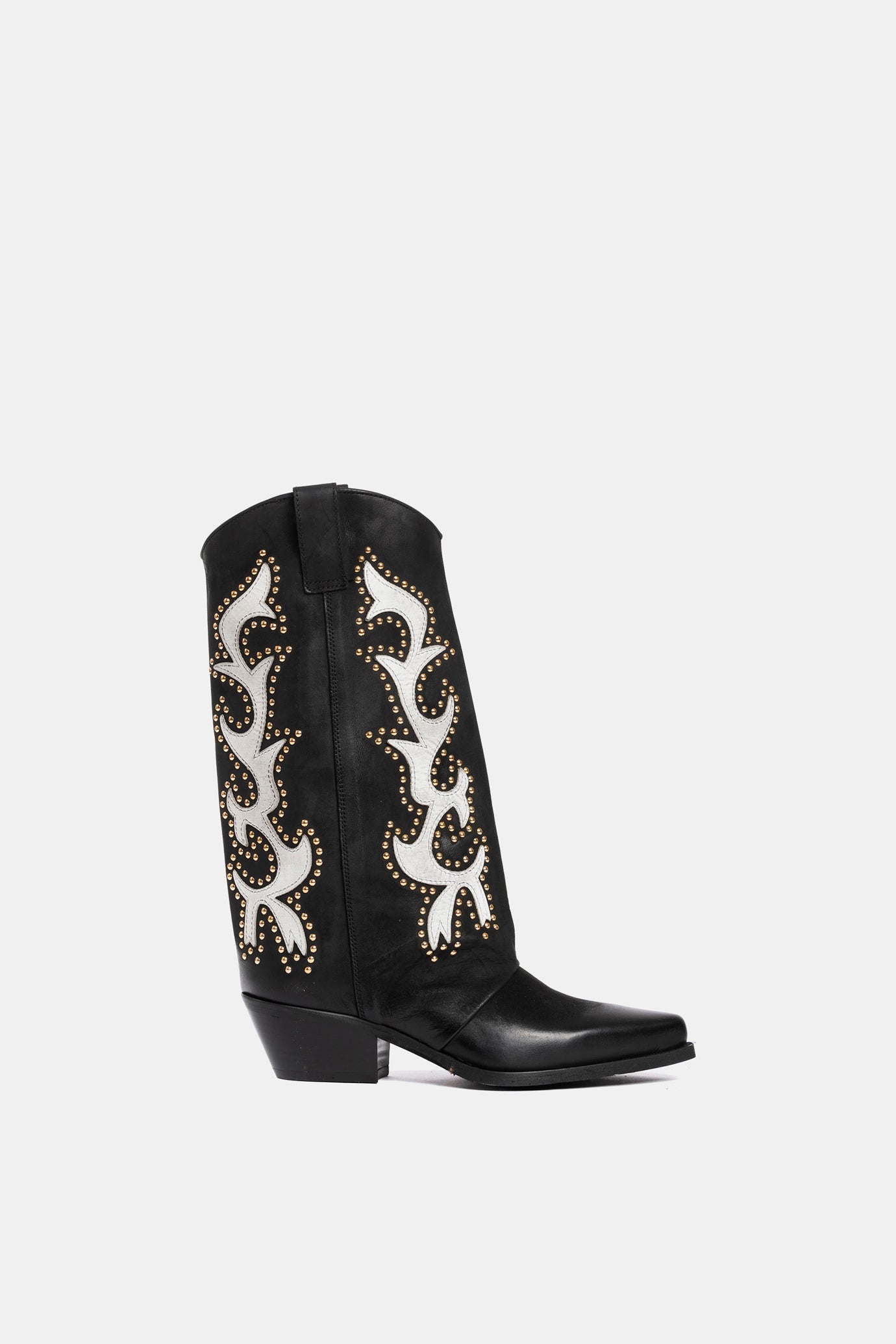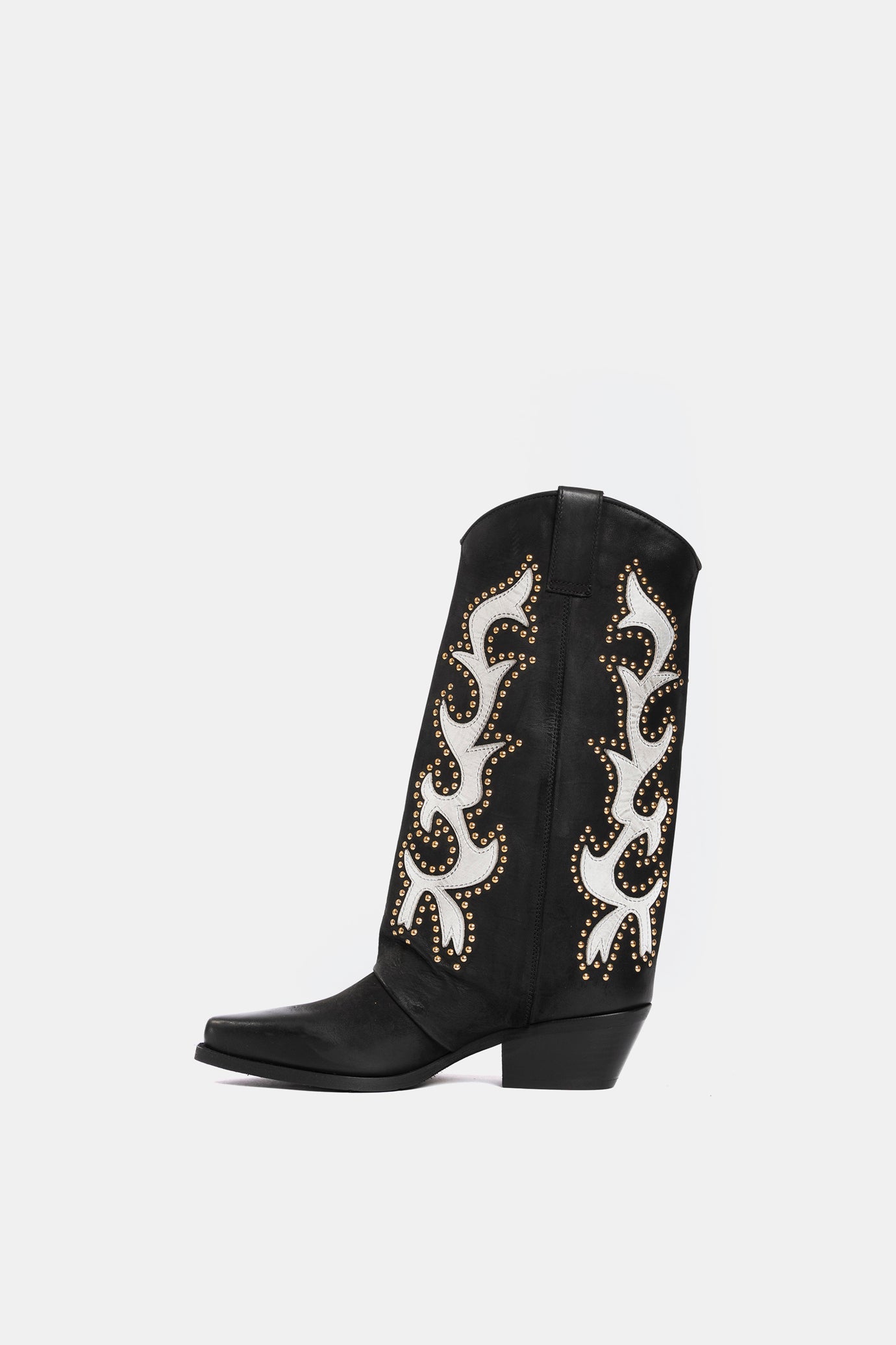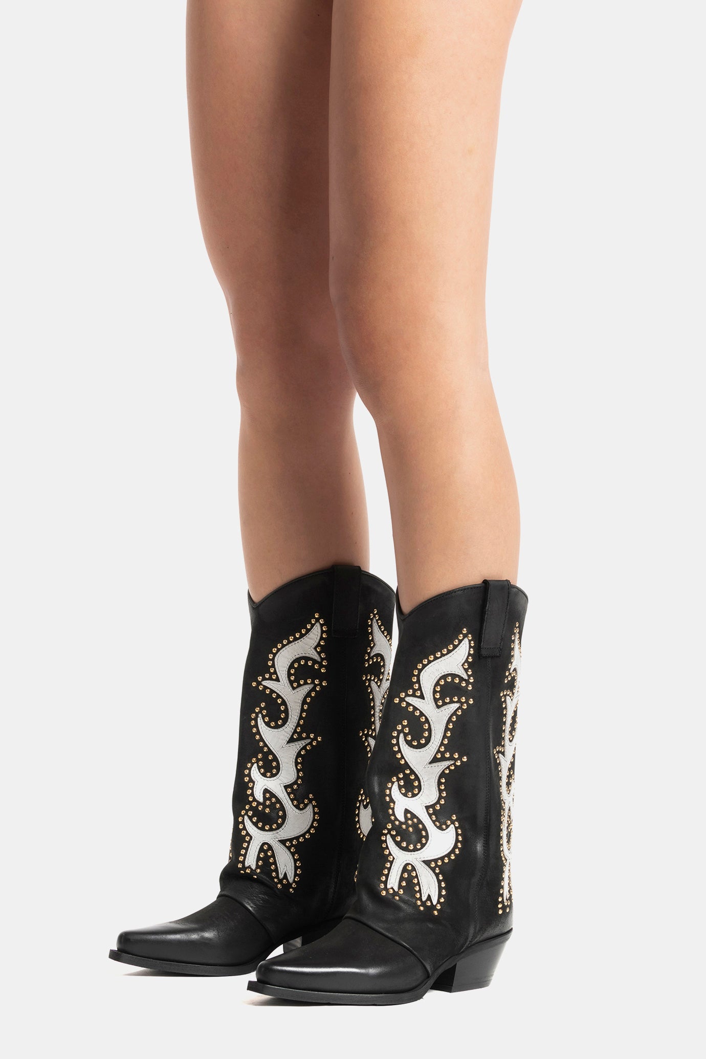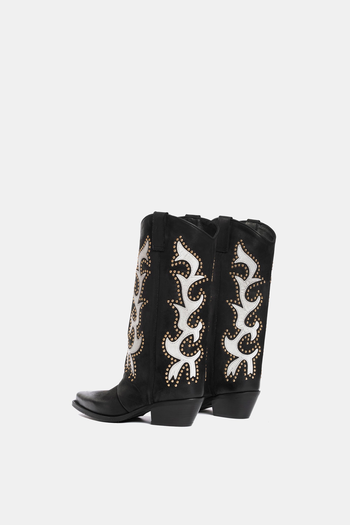 Stivali texani in vitello nero con decorazioni bianche e borchie oro