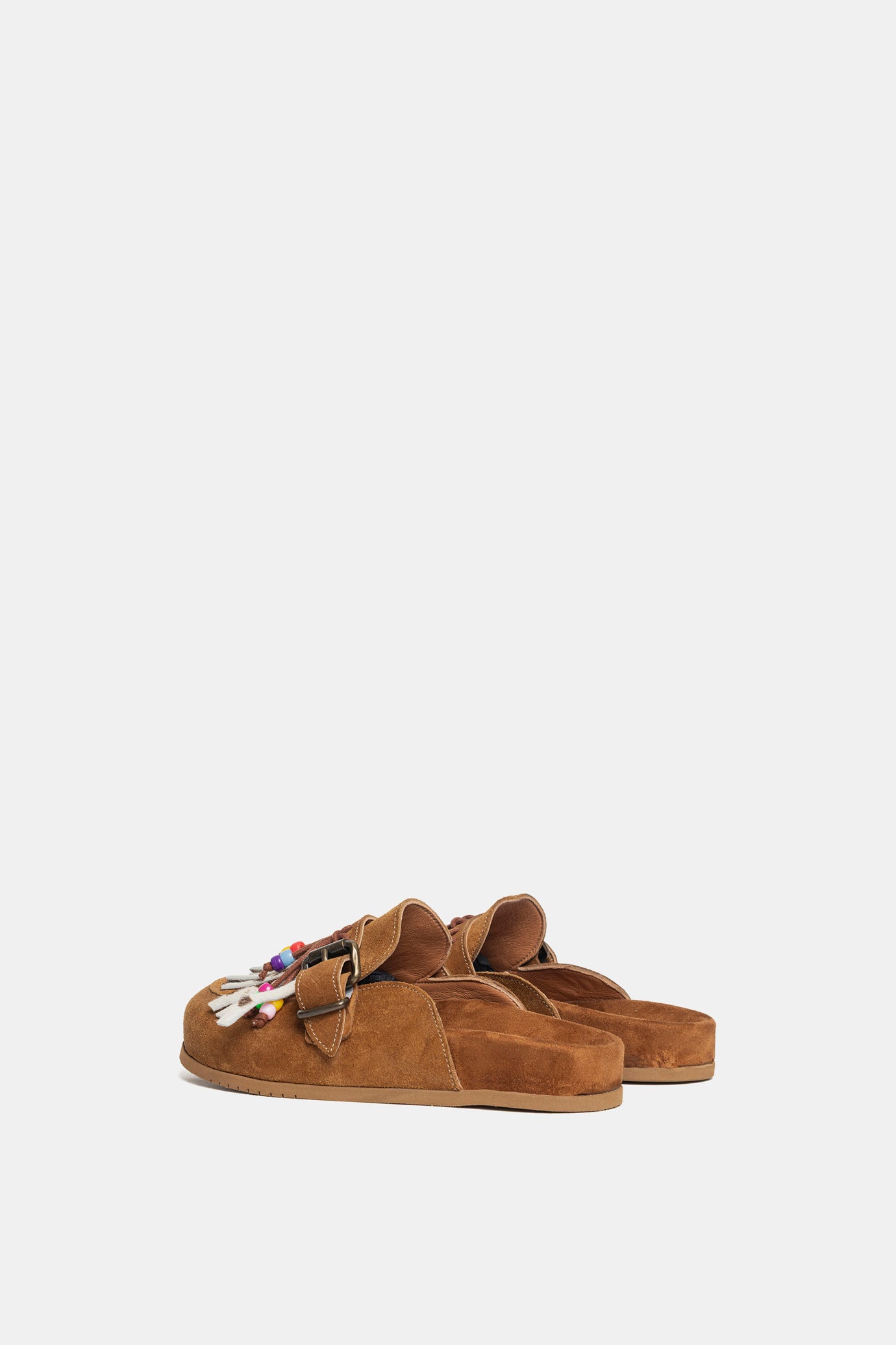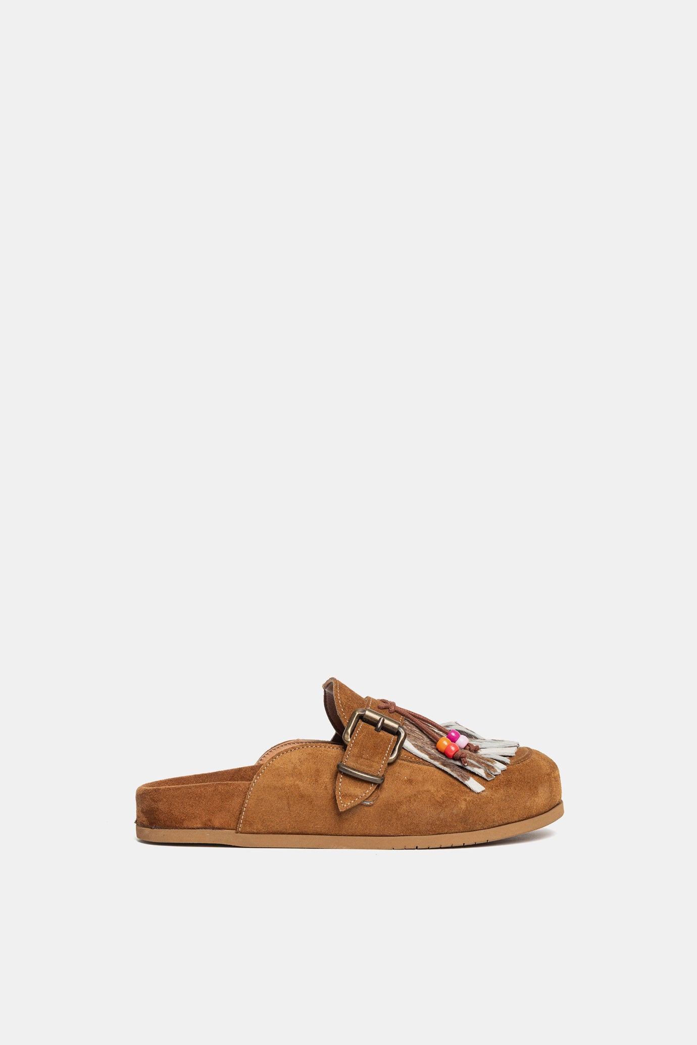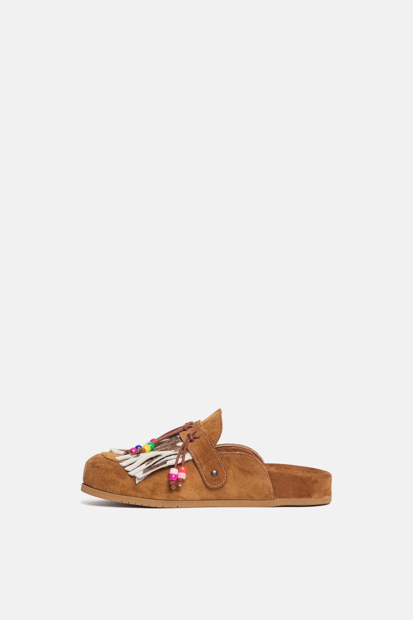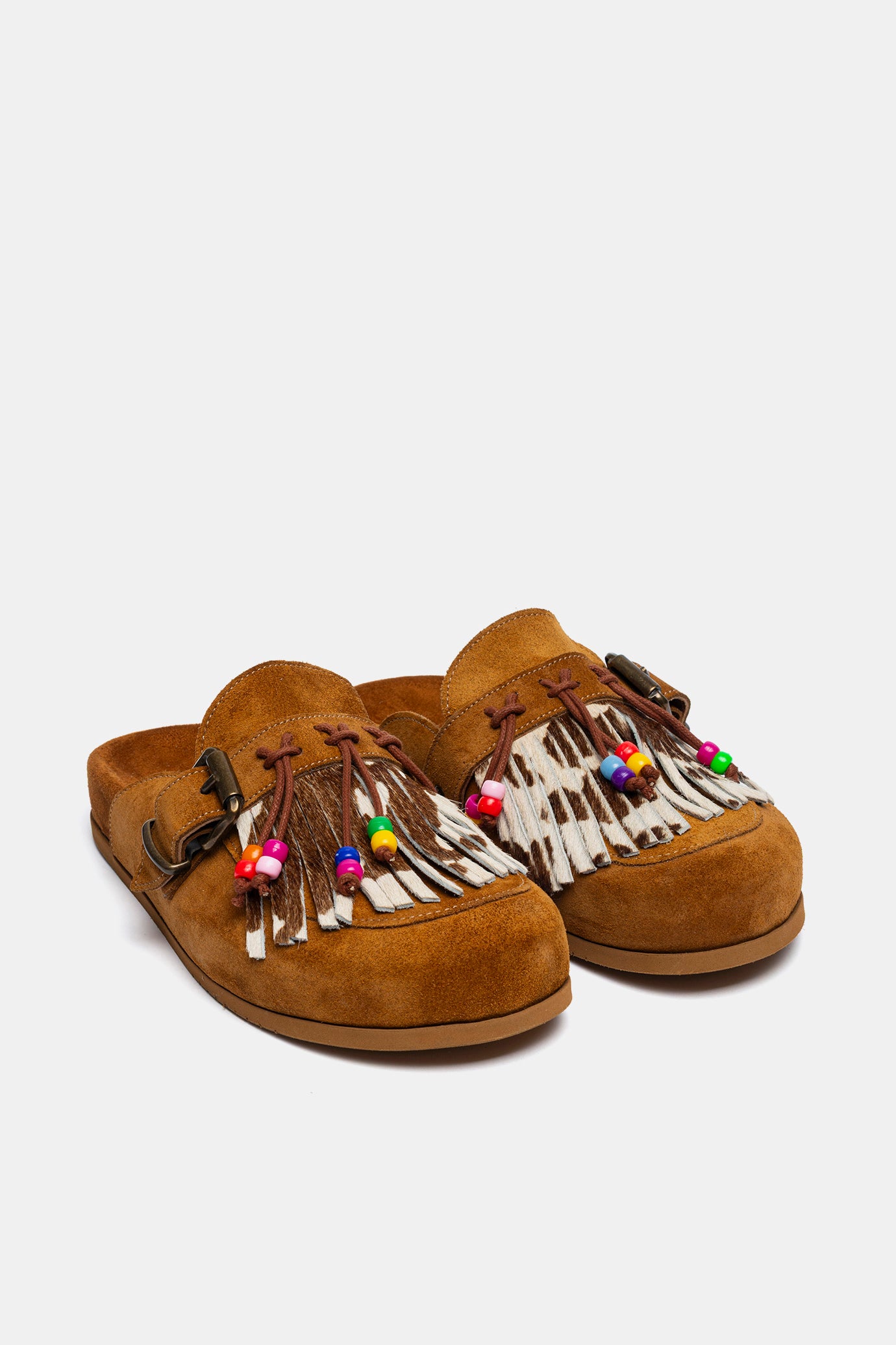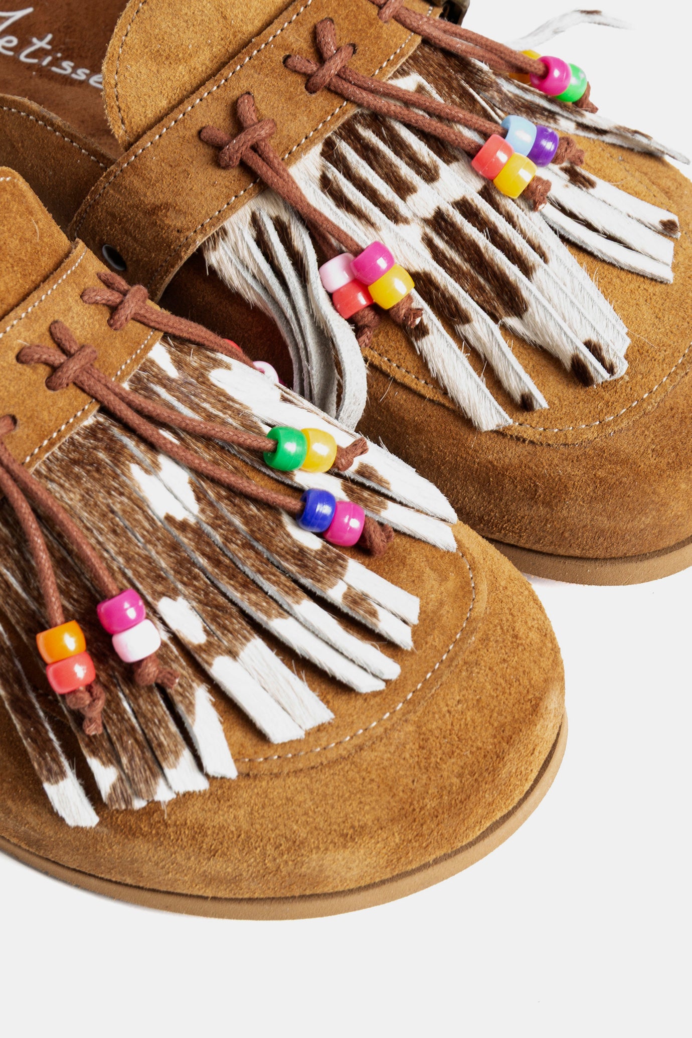 Sabot camoscio cuoio con frange cavallino e corallini colorati FUS6