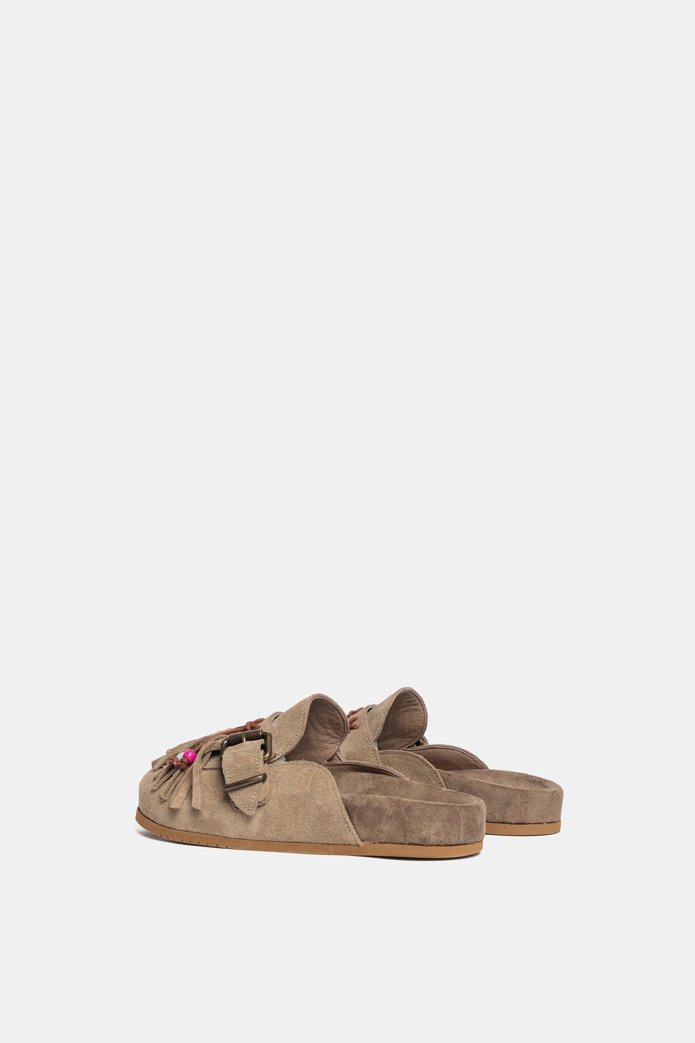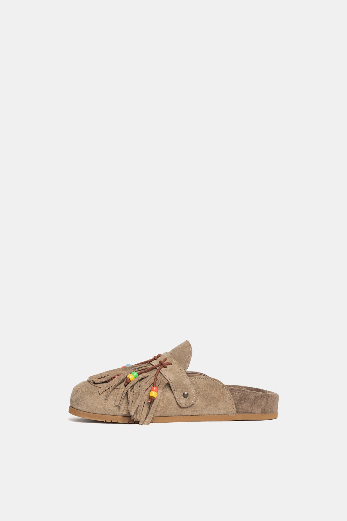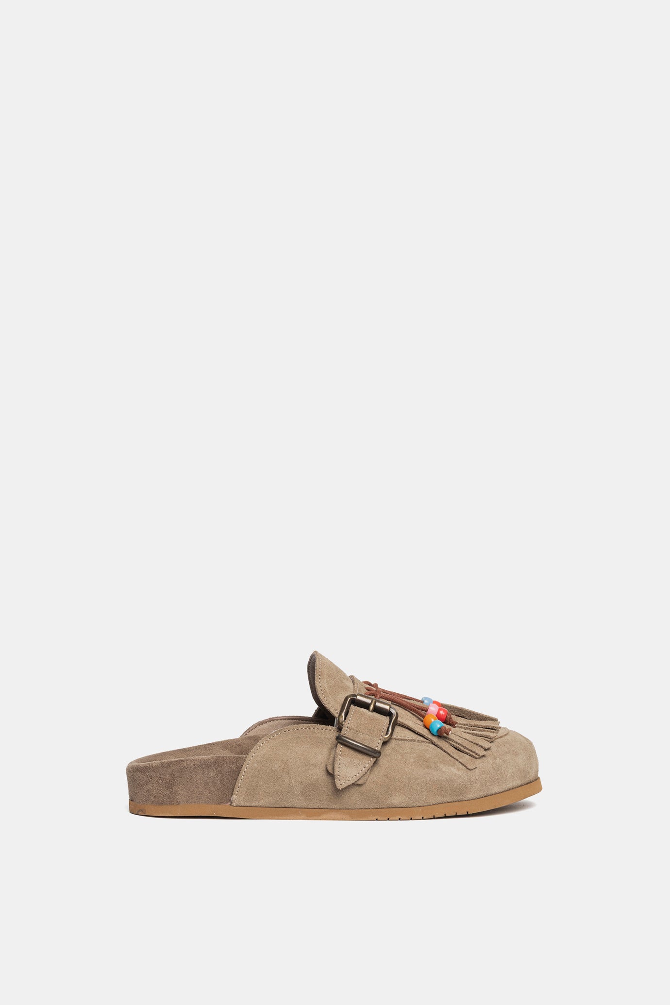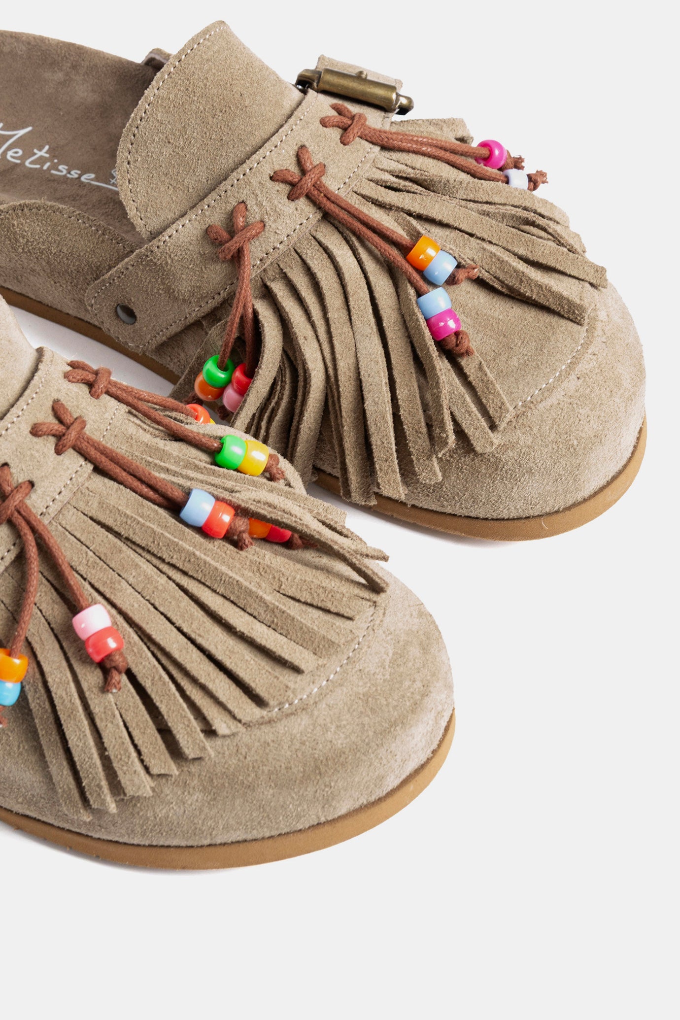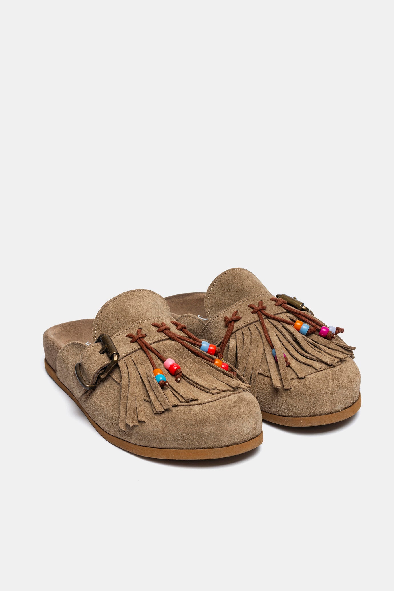 Sabot in camoscio tortora con frange e corallini colorati FUS6