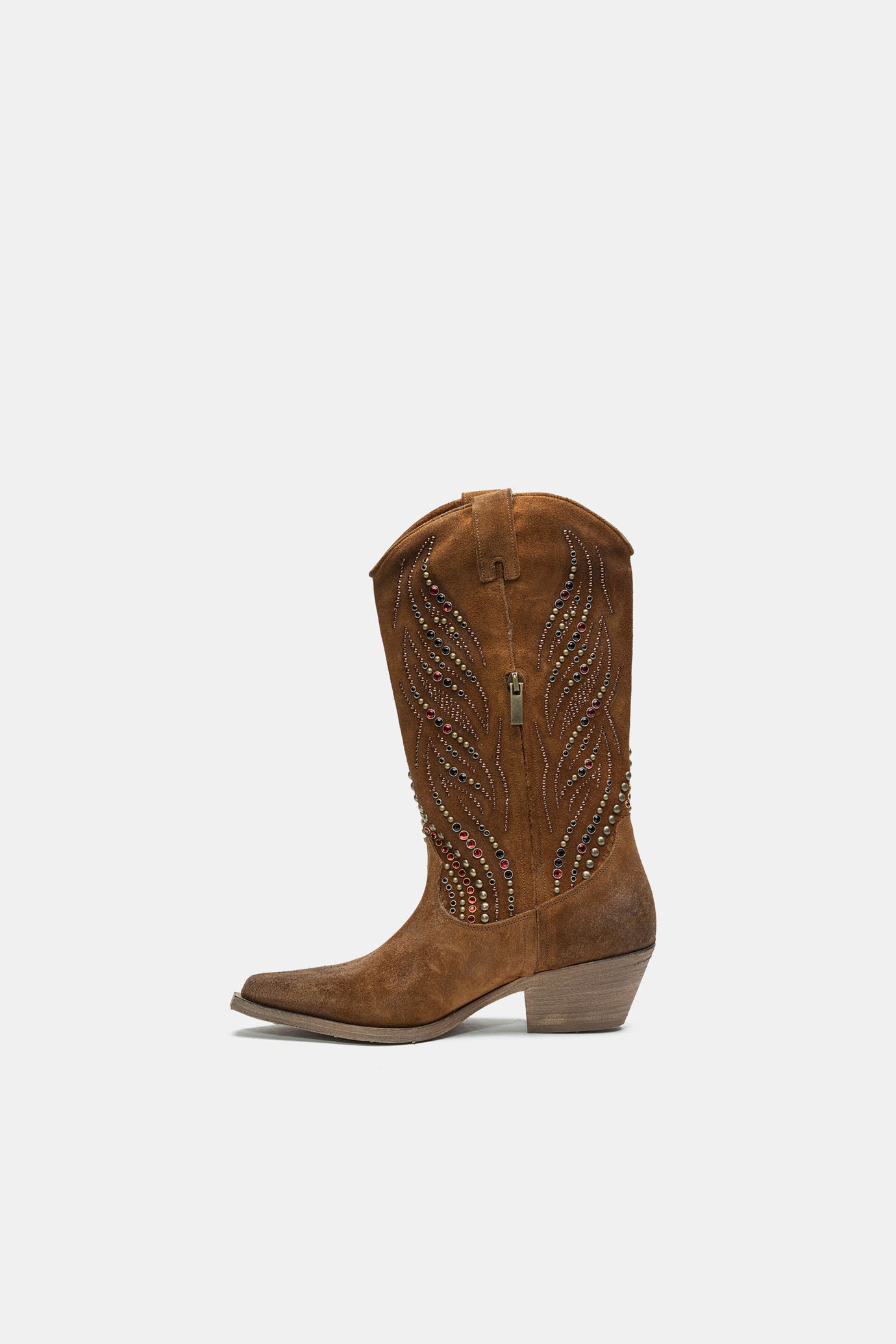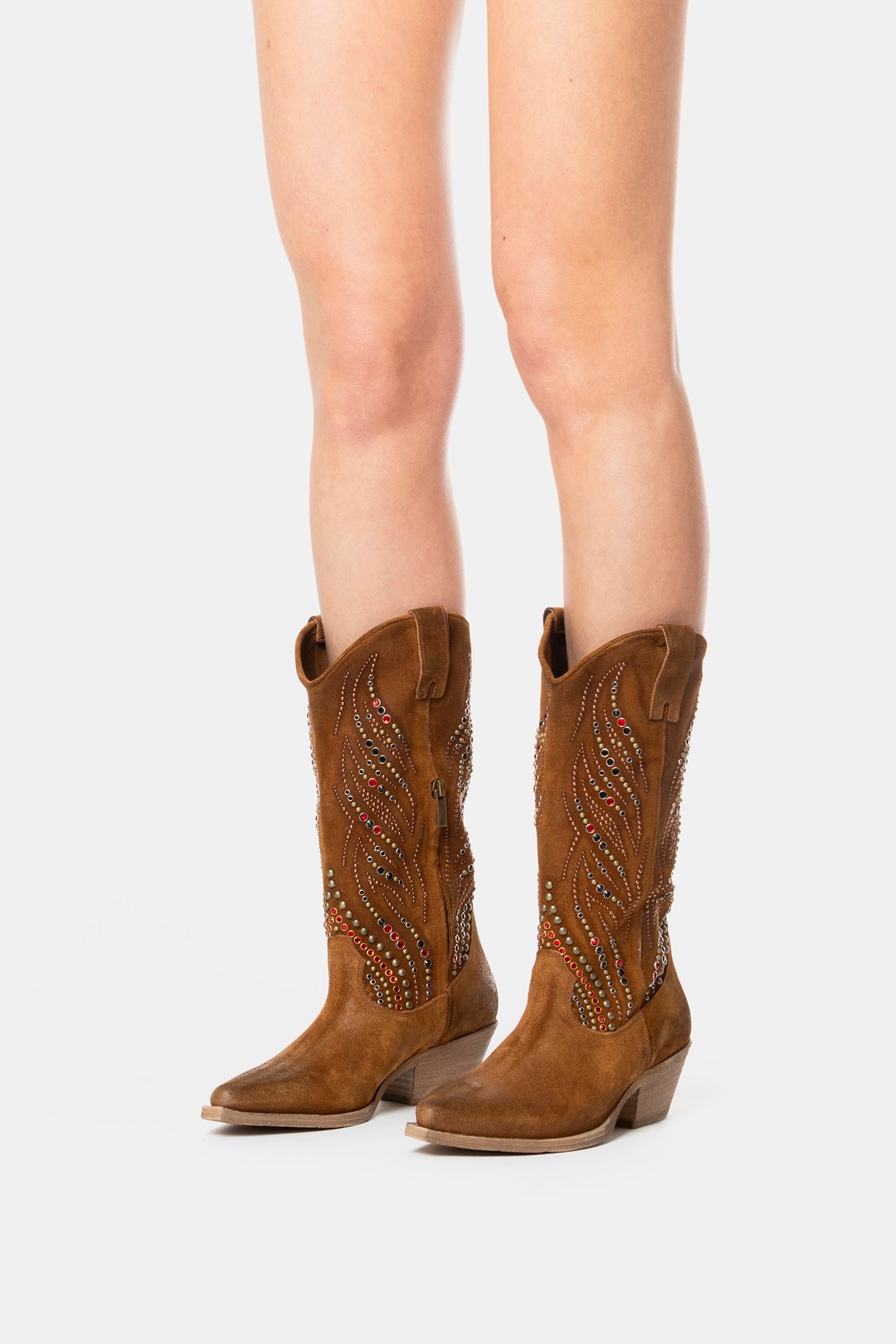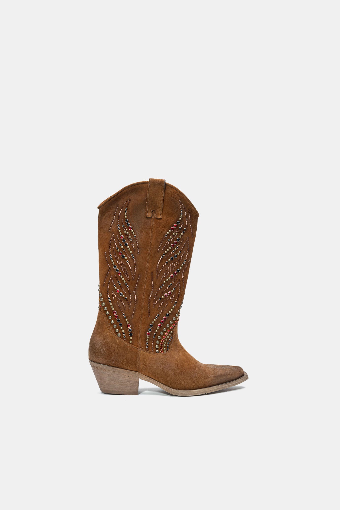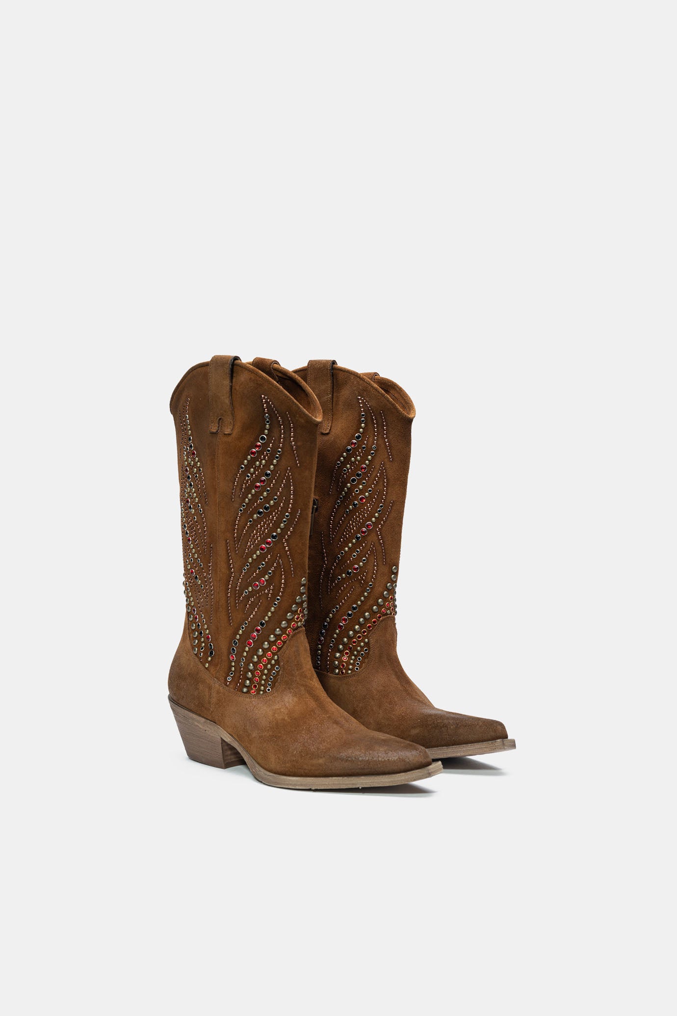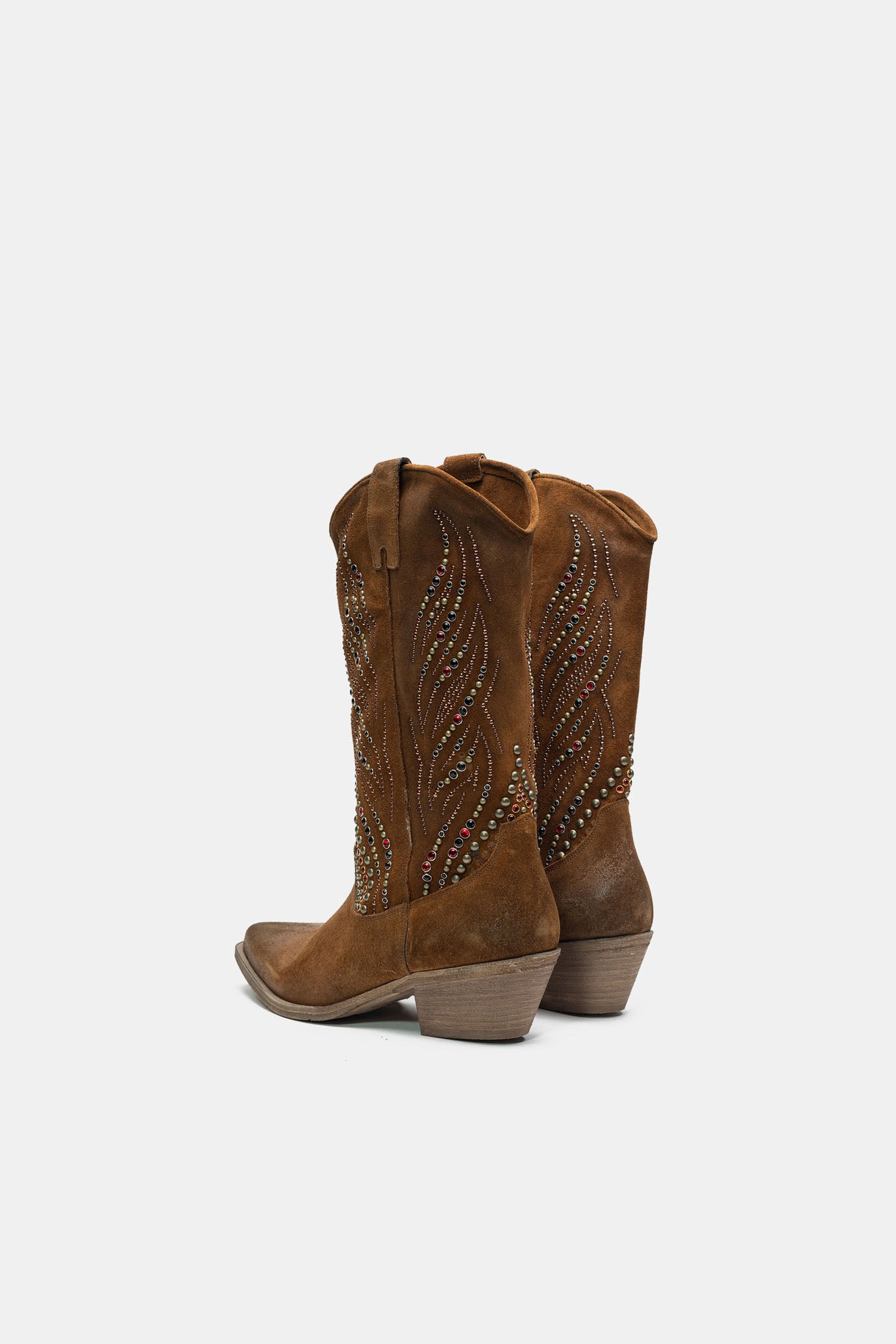 Stivali texani realizzati con materiali morbidi e completamente spazzolati ed invecchiati a mano. Impreziosito con borchie e pietre colorate
