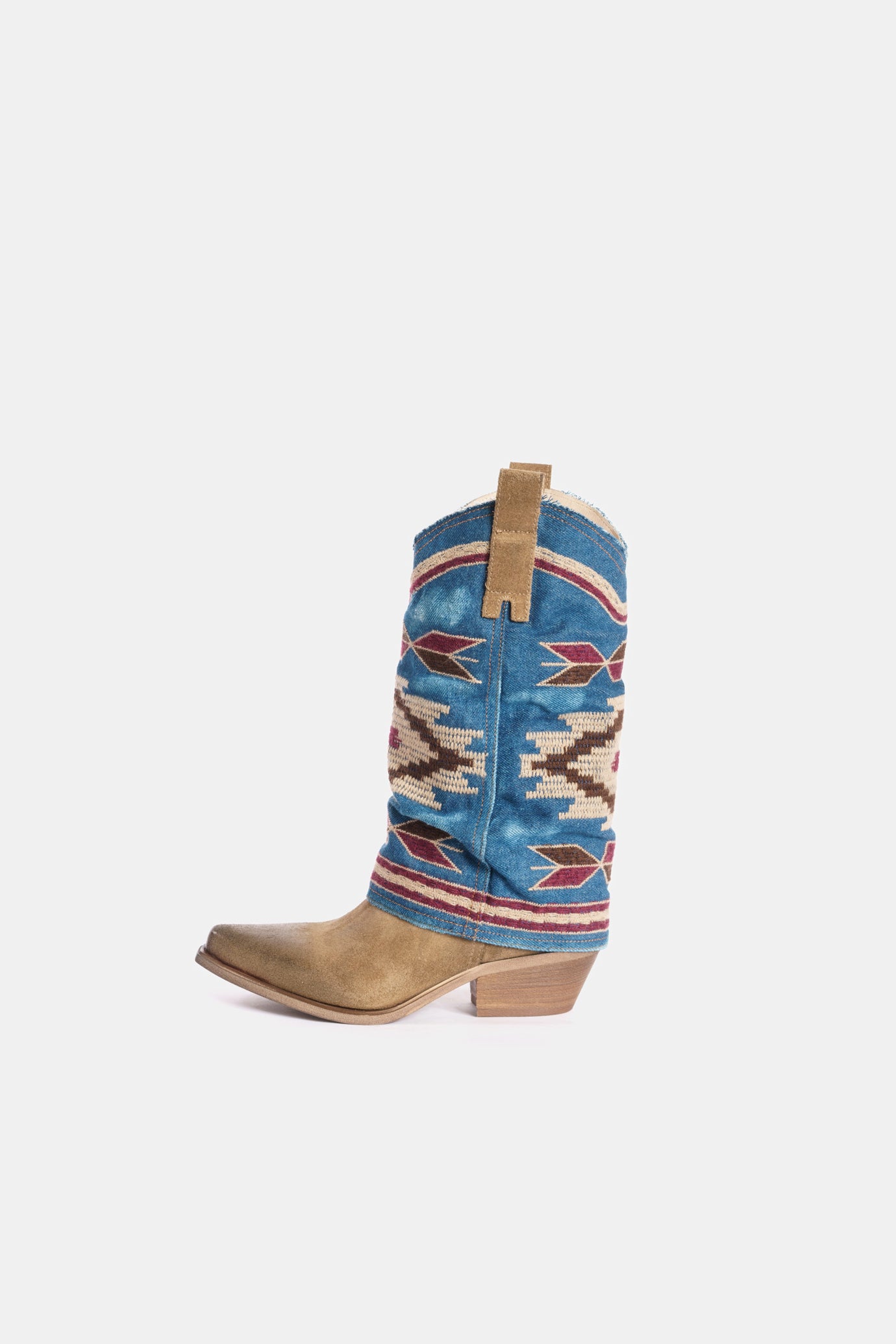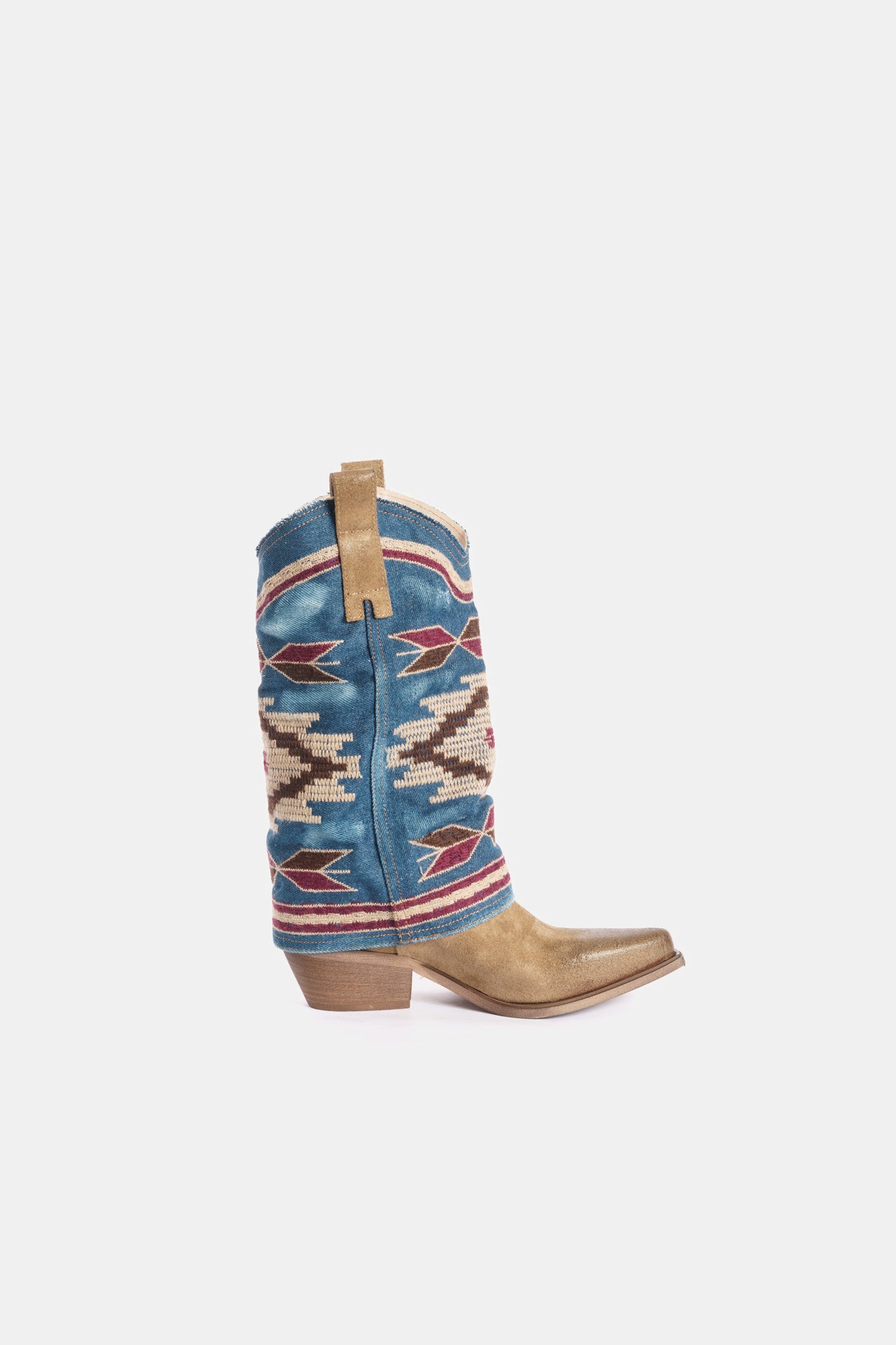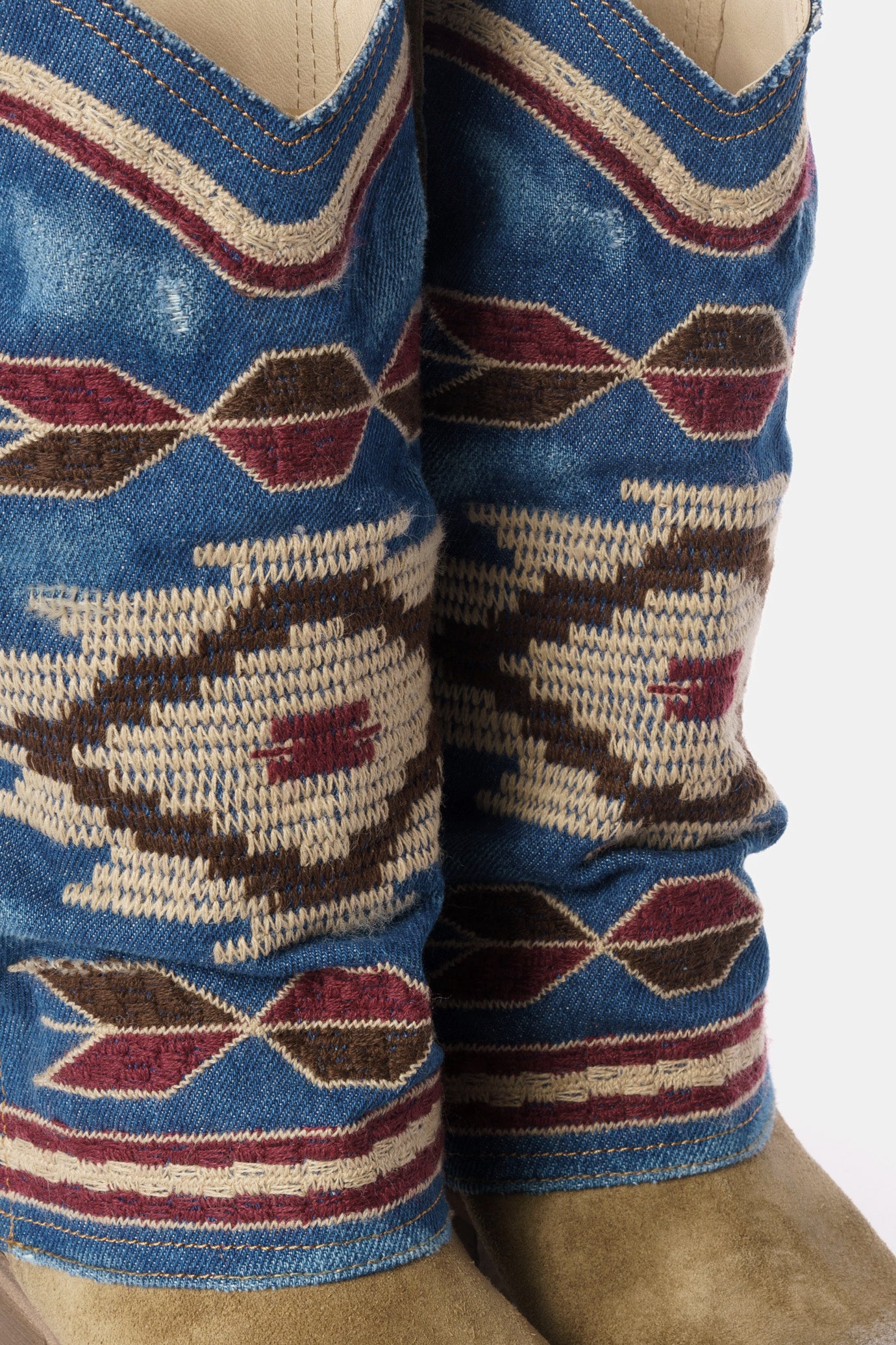 Stivali texani camoscio tortora e jeans vintage con ricami etnici DX638